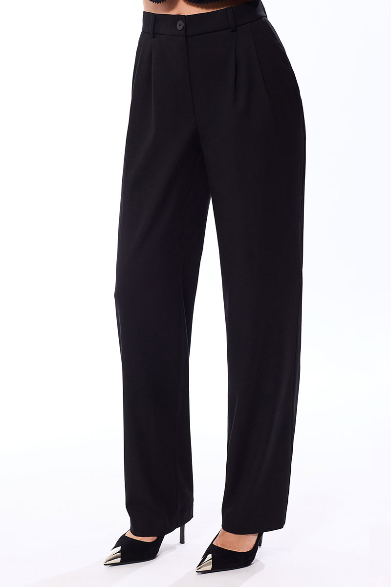Брюки прямые, с отрезным поясом и шлевками. В области спинки пояс присборен на резинку. На передних половинках расположены две односторонние складки и карманы. Вход в карман наклонный к боковому шву. Застежка гульфик.
