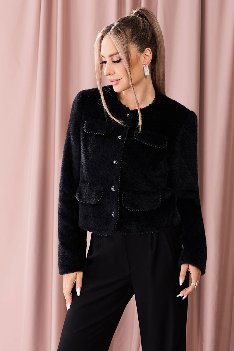 Жакет прямого силуэта с центральной застежкой на петли и пуговицы, без воротника, с круглым вырезом горловины. По переду с нагрудными вытачками. На уровне груди и линии талии расположены настрочные клапаны. Спинка со средним швом. Рукав втачной, длинный.