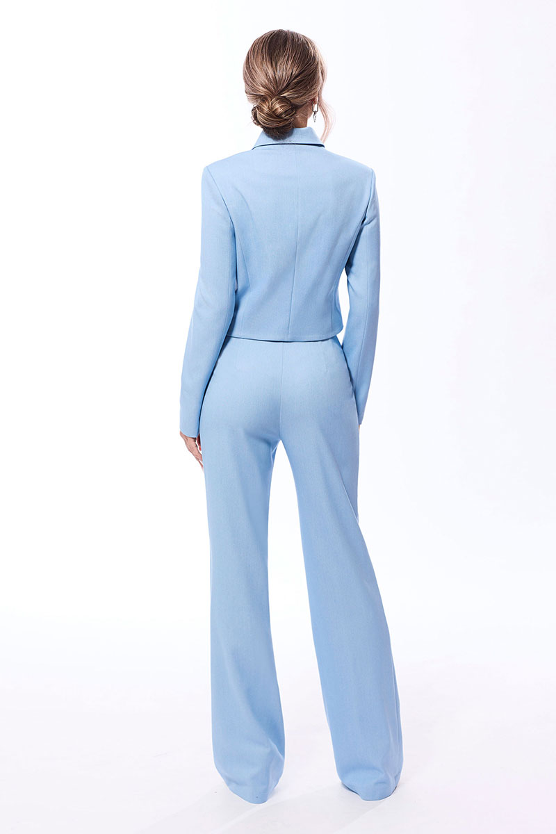 Брюки прямые, без пояса, верхний срез обработан обтачками. На передних половинках расположены накладные карманы. Застежка гульфик.