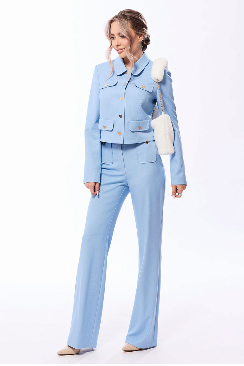 Жакет прямого силуэта с центральной застежкой на петли и пуговицы, с втачным воротником. По переду с рельефами, выходящими из проймы. На уровне груди и линии талии расположены настрочные клапаны . Спинка со средним швом, рельефами, выходящими из проймы. Рукав втачной, длинный.