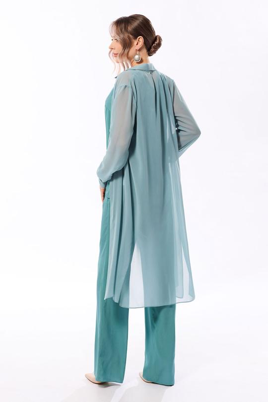 Блузон с центральной застежкой на петли и пуговицы, втачным воротником с отрезной стойкой. По переду с нагрудными вытачками, спинка цельная, по боковым швам- разрезы. Рукав втачной, длинный, с отрезной манжетой.