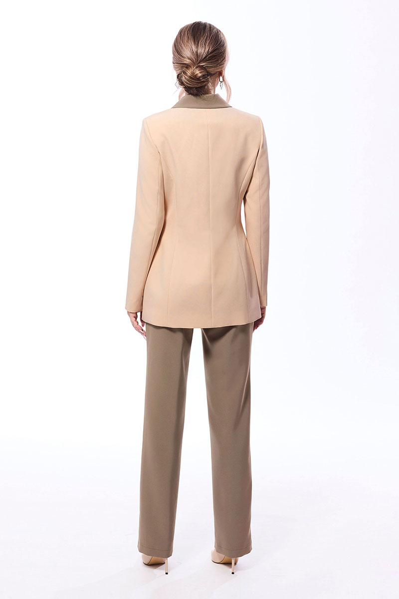 Цветовая гамма для верха, подкладки, фурнитуры, отделки: комплект выполнен из ткани в одной цветовой гамме. Воротник, лацканы жакета, пуговицы и брюки контрастны основной ткани жакета