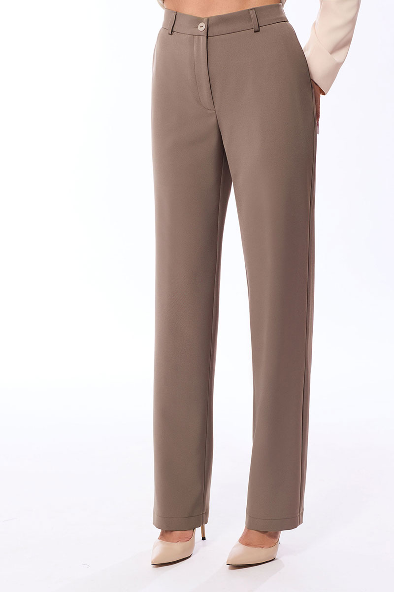 Брюки прямые, с отрезным поясом, на поясе расположены шлевки. Пояс в области спинки присборен на резинку. На передних половинках расположены карманы, вход в карман наклонный к боковому шву. Застежка гульфик.