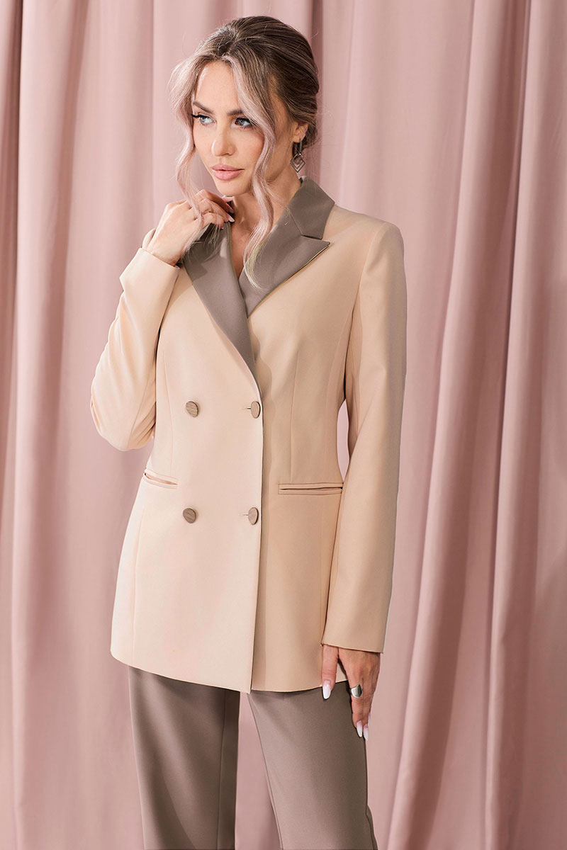Жакет полуприлегающего силуэта с центральной двубортной застежкой на петли и пуговицы, с втачным воротником и отложными лацканами пиджачного типа. По переду с рельефами, выходящими из проймы, талиевыми вытачками. На уровне линии талии расположены прорезные карманы в рамку . Спинка со средним швом, рельефами, выходящими из проймы. Рукав втачной, длинный.