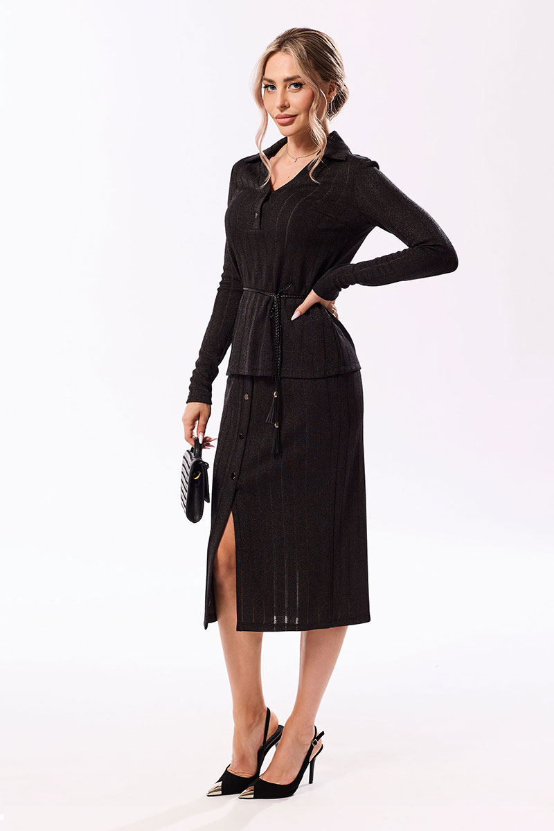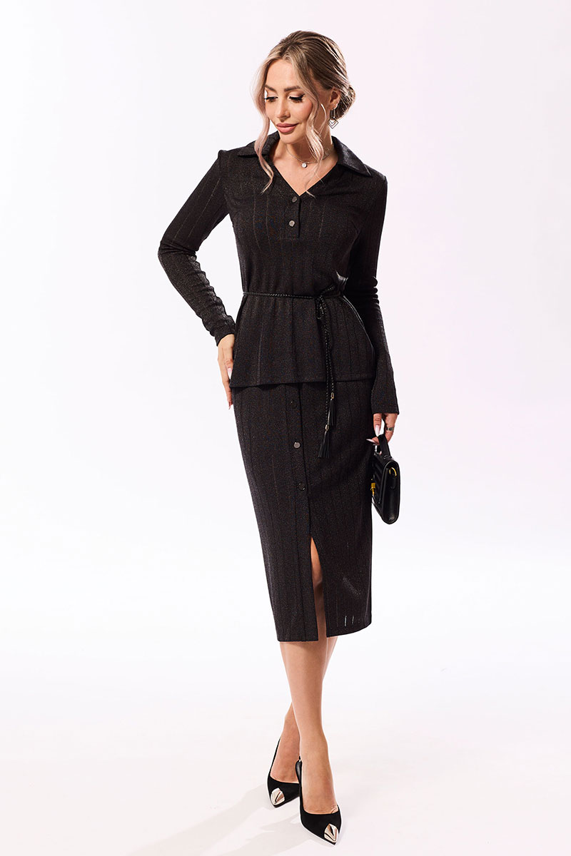Юбка прямая, без пояса, верх присборен на резинку. Переднее полотнище со средним швом, заканчивающимся щлицей. По среднему шву отрезная планка с декоративными пуговицами. Комплект с декоративным съемным поясом.