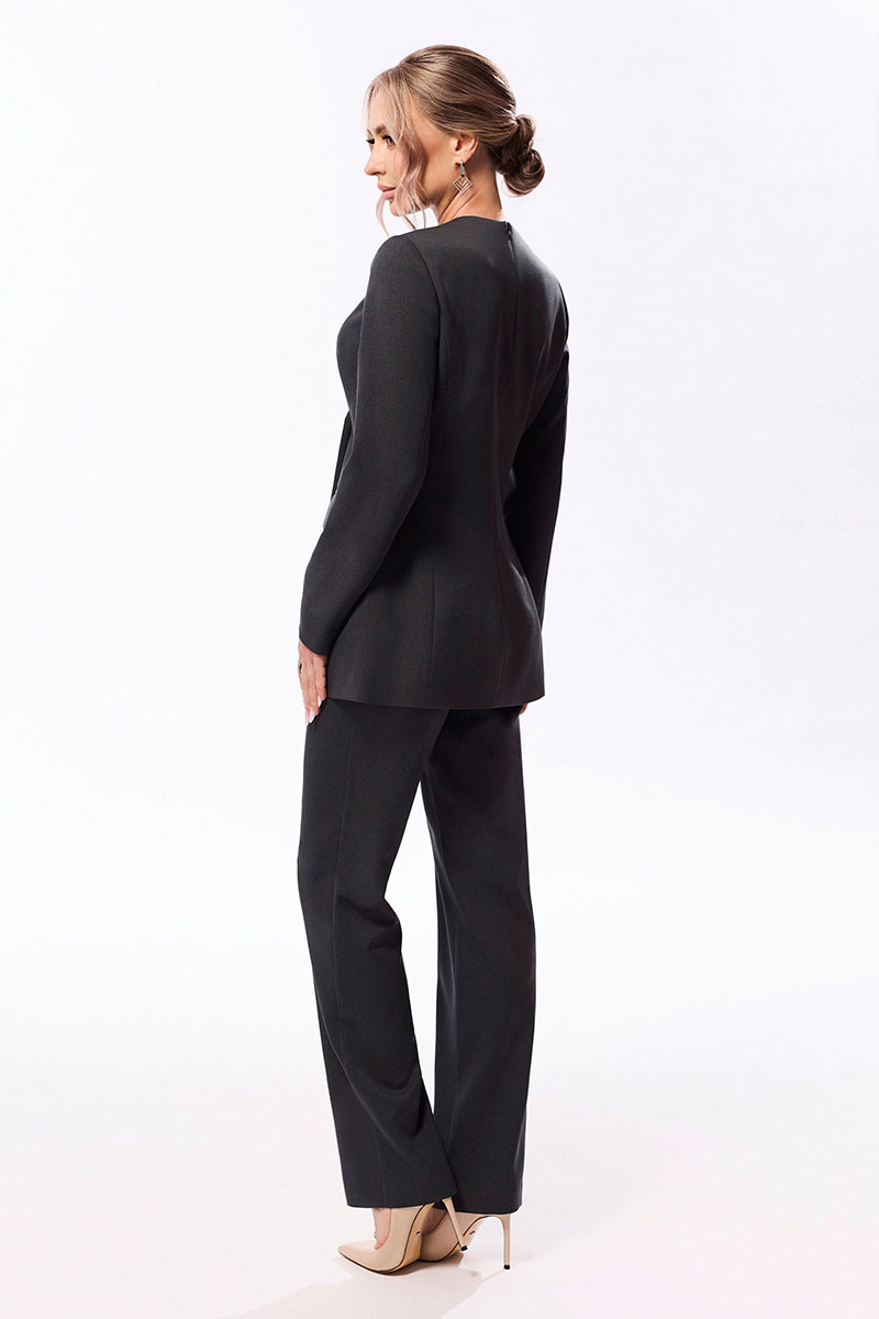 Жакет полуприлегающего силуэта, с центральной двубортной застежкой на петли и пуговицы, и потайной молнией по среднему шву спинки, без воротника, с круглым вырезом горловины, и фигурным вырезом- капелькой на уровне груди. По переду с рельефами, выходящими из проймы, талиевыми вытачками, прорезными карманами с клапанами и двумя обтачками. Спинка со средним швом, рельефами, выходящими из проймы. Рукав втачной, длинный.