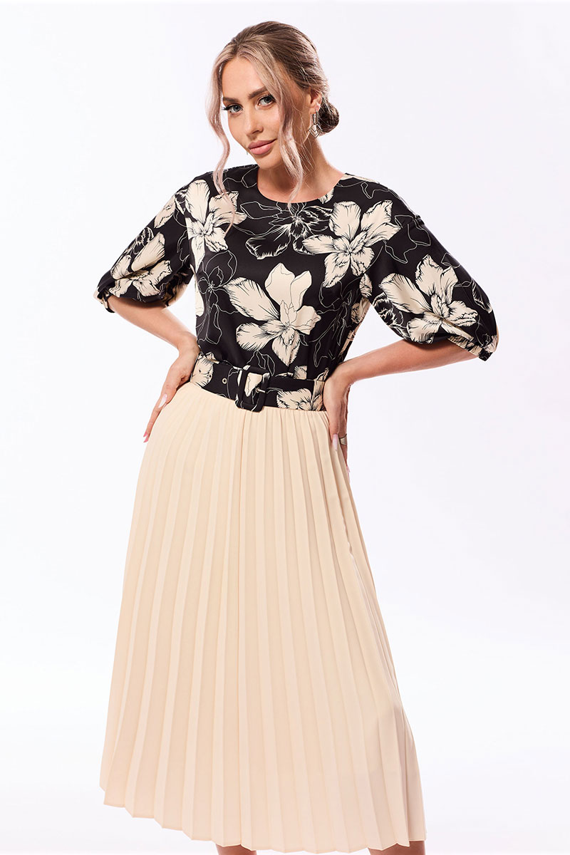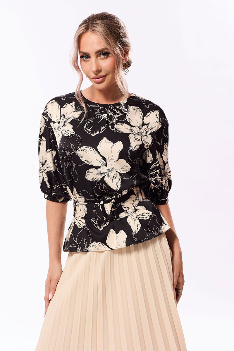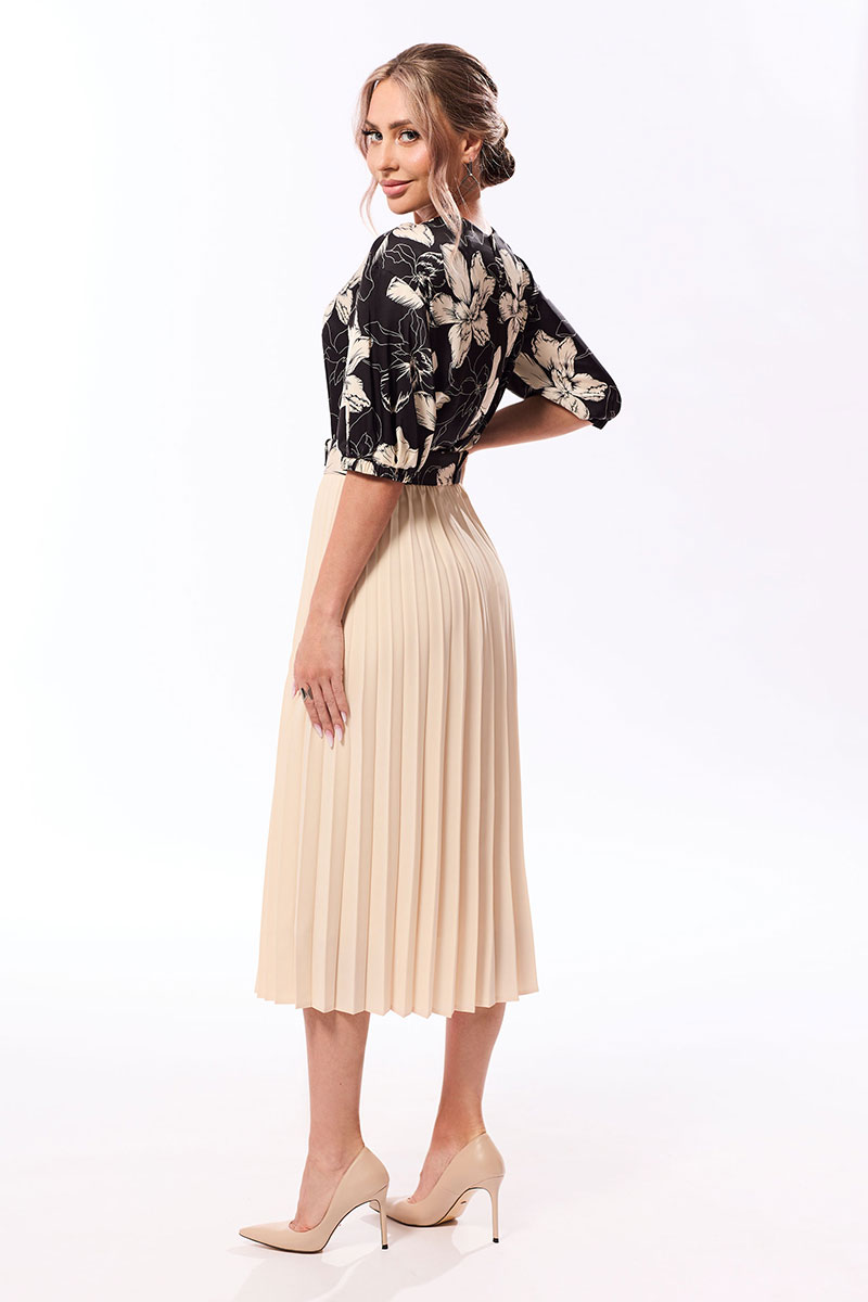 Цветовая гамма для верха, подкладки, фурнитуры, отделки: блузка выполнена из ткани в одной цветовой гамме. Юбка выполнена из ткани с рисунком
