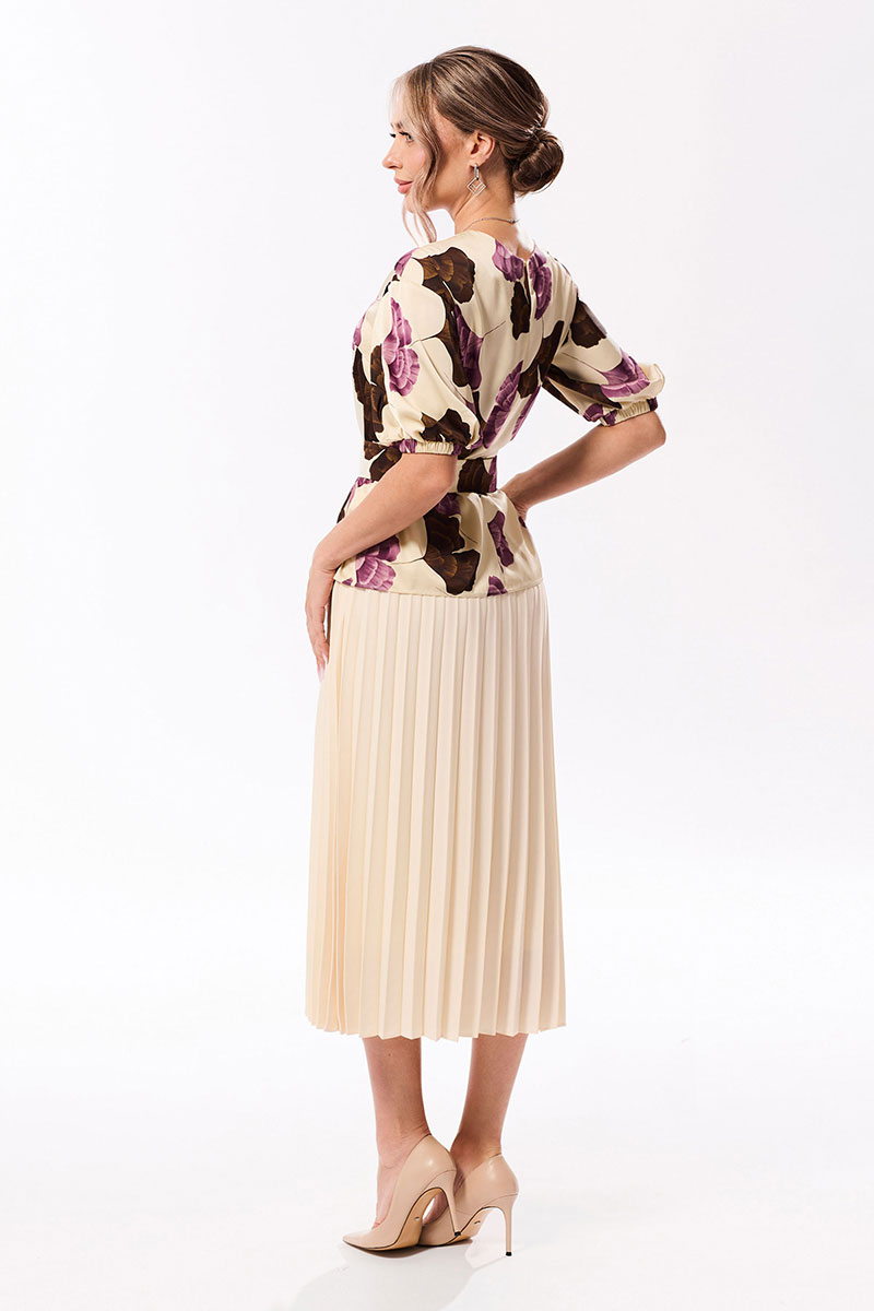 Цветовая гамма для верха, подкладки, фурнитуры, отделки: блузка выполнена из ткани в одной цветовой гамме. Юбка выполнена из ткани с рисунком