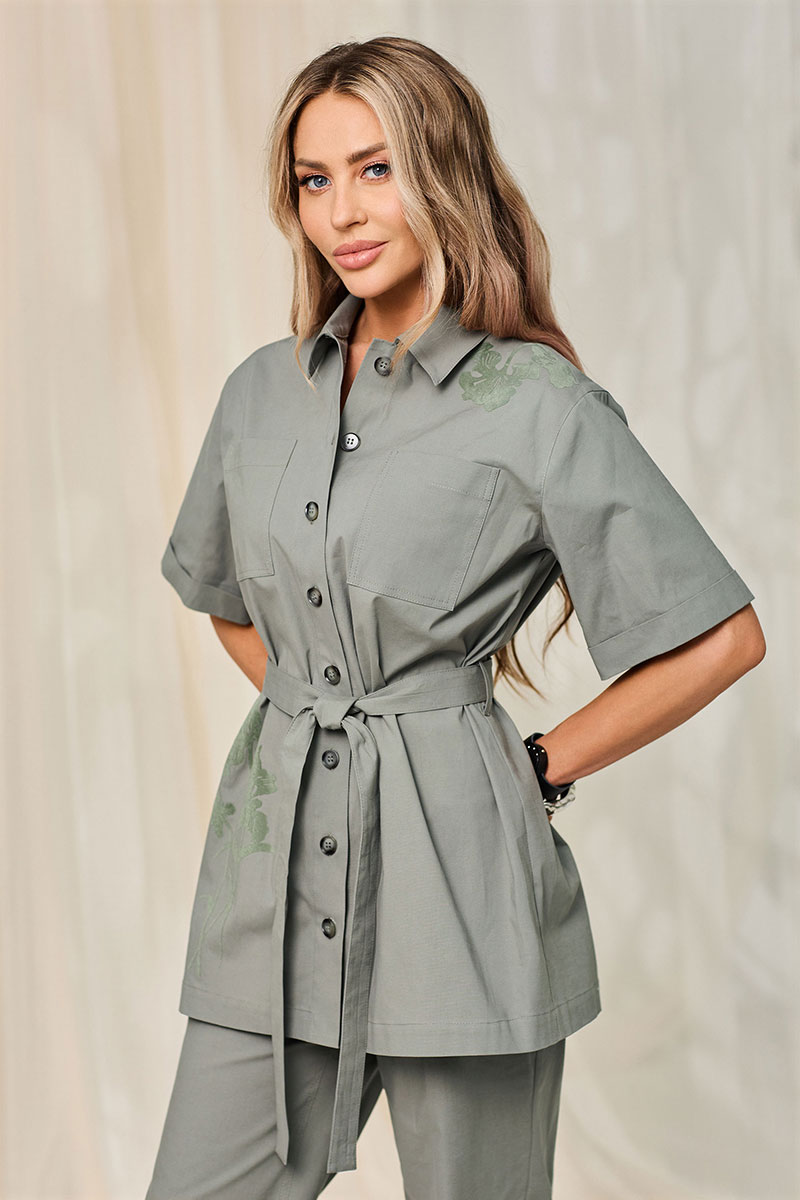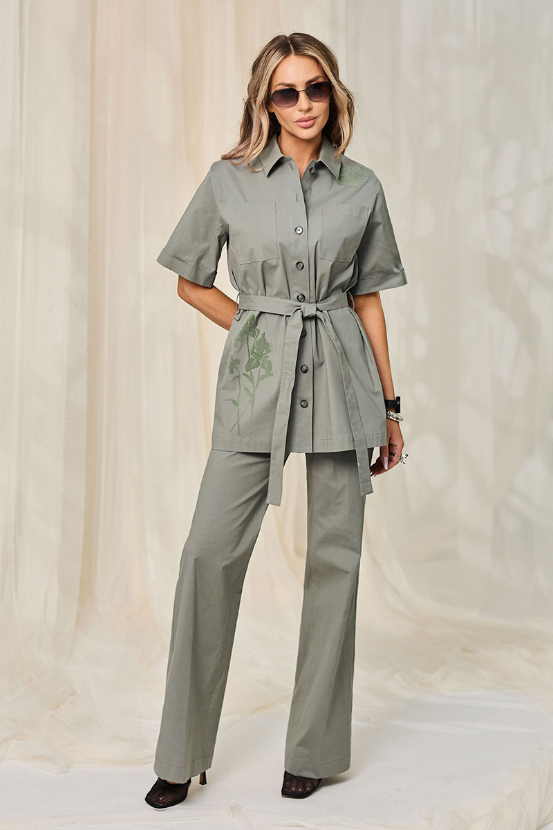 Блузка с центральной застежкой на петли и пуговицы, с отложным воротником. По верхней части переда- накладные карманы. Плечевой шов переходит на перед. Спинка со средним швом. Рукав втачной, короткий, с отложной манжетой. Блузка со съемным поясом. По боковым швам расположены шлевки для пояса. Брюки с отрезным поясом, на поясе расположены шлевки. На задних половинках расположены прорезные карманы с листочками. На передних половинках расположены карманы, вход в карман фигурный. Застежка гульфик.