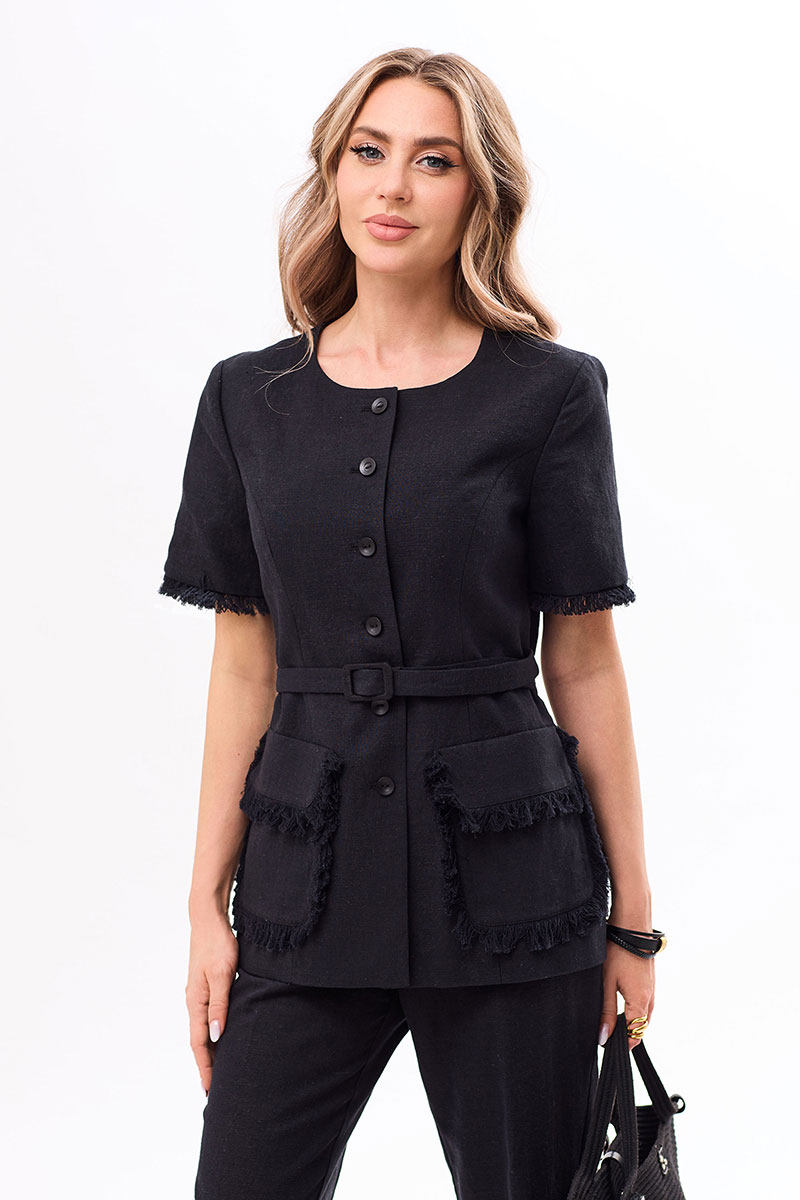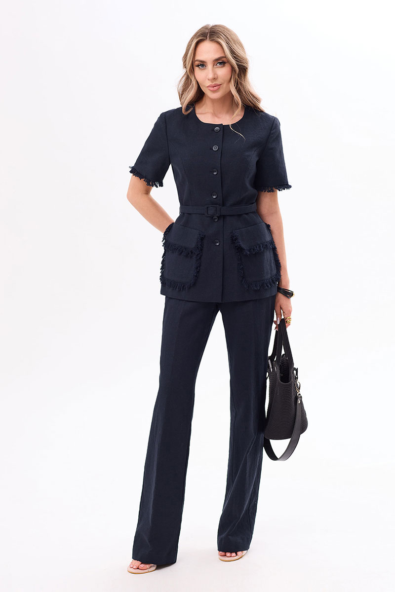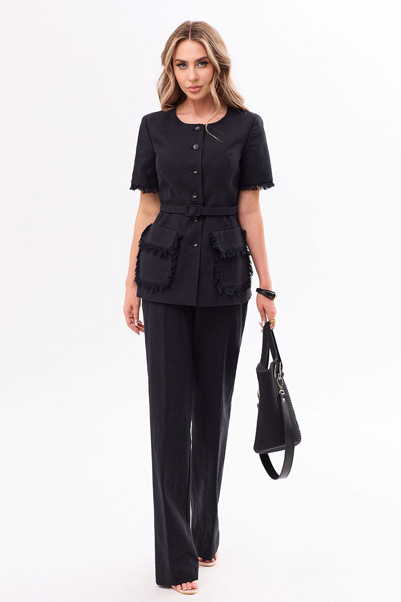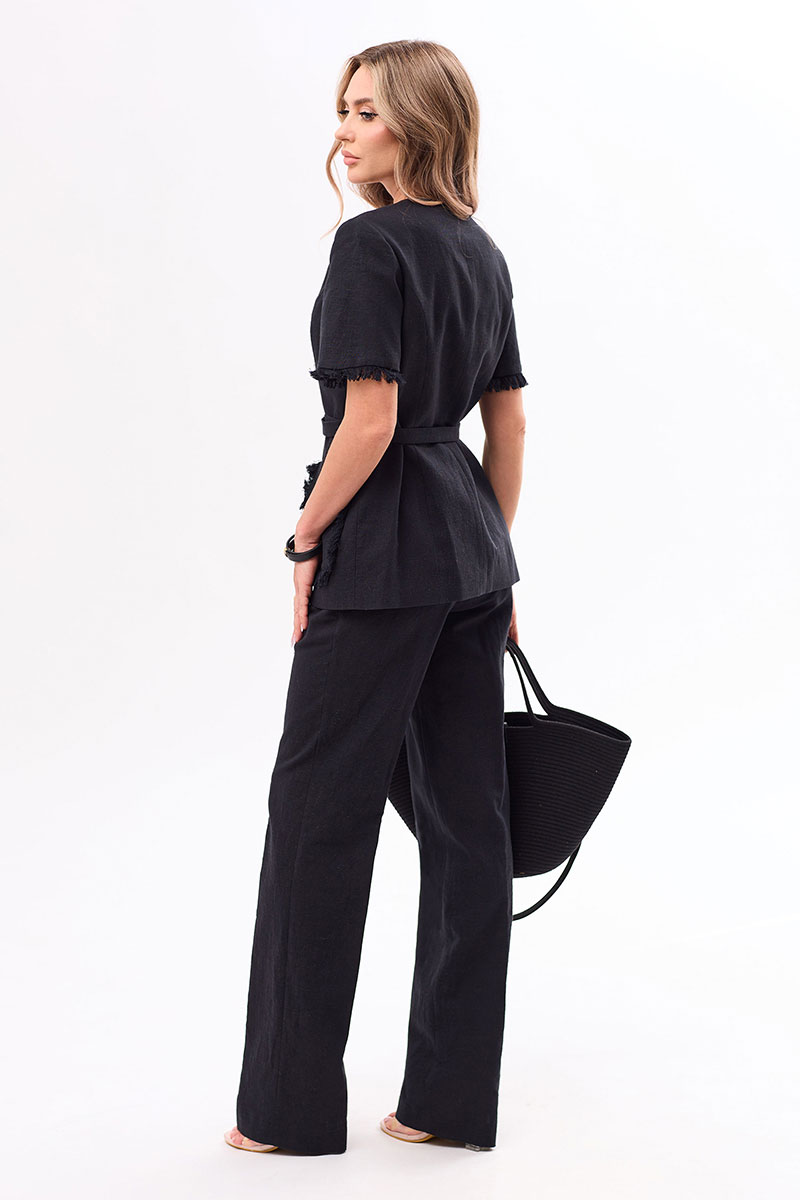 Жакет с центральной застежкой на петли и пуговицы с без воротника, с круглым вырезом горловины. По переду с рельефами, выходящими из проймы до низа и накладными карманами с клапанами, расположенными на уровне линии бедер. Спинка со средним швом, рельефами, выходящими из проймы. Жакет со съемным поясом. Рукав втачной, короткий. По низу рукава, низу клапанов, краю накладных карманов притачивается бахрома из основной ткани. Брюки без пояса, верхний срез обработан обтачками. Застежка на потайную молнию в левом боковом шве. В области спинки талия присборена с помощью резинки.
