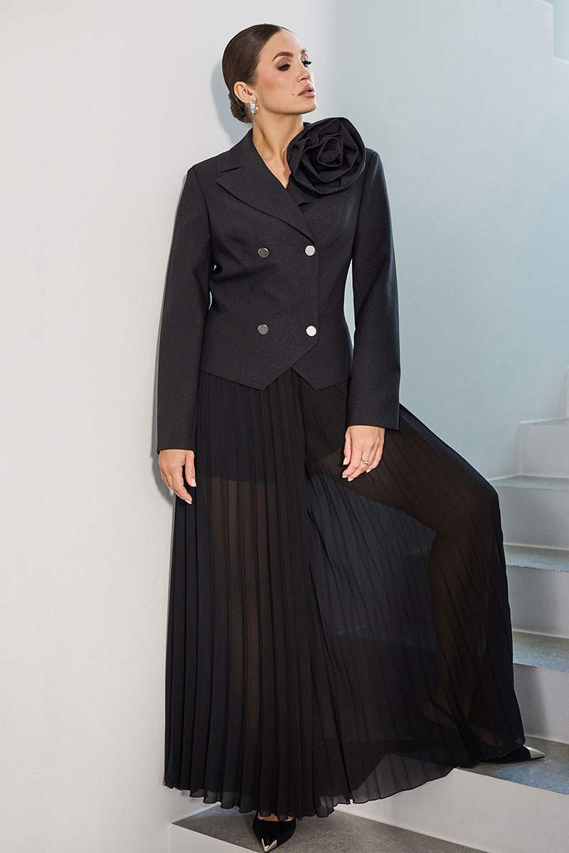 Жакет с центральной двубортной застежкой на петли и пуговицы, втачным воротником и лацканом пиджачного типа. По переду с рельефами, выходящими из плеча. По спинке со средним швом и рельефами, выходящими из плеча. Низ жакета фигурный. Рукав втачной, длинный. Жакет со съемной декором- брошью из основной ткани.