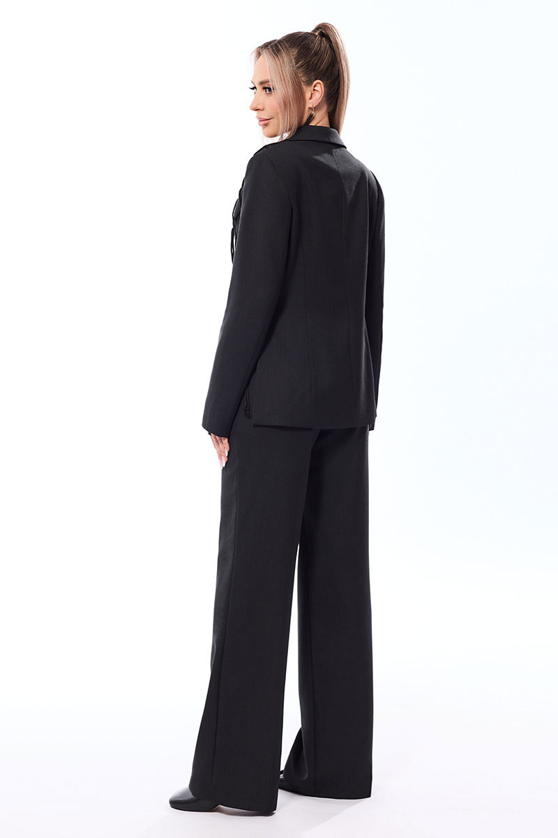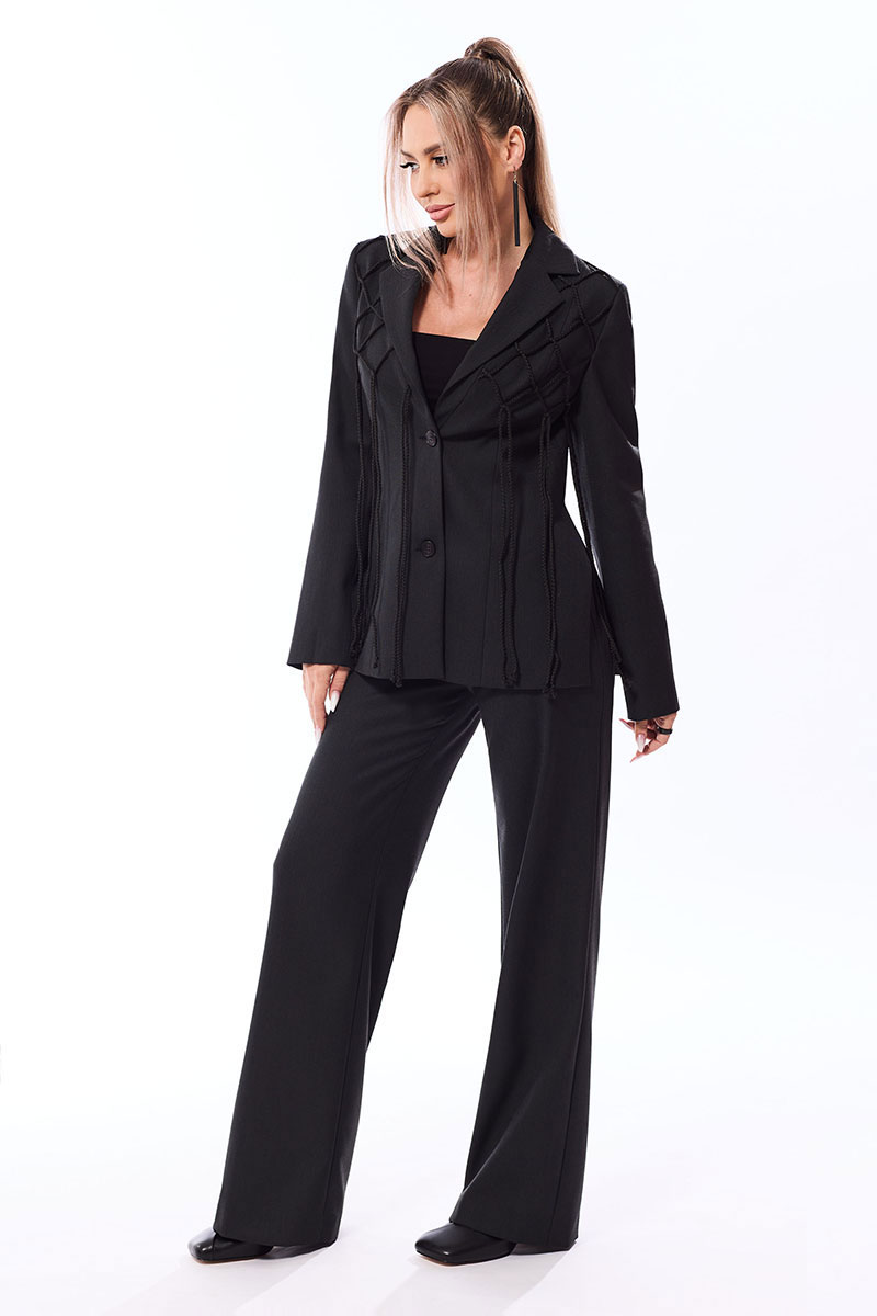 Жакет с центральной застежкой на петли и пуговицы, отложным воротником и лацканами пиджачного типа. По переду с рельефами, выходящими из плеча. Спинка со средним швом, рельефами, выходящими из проймы. В боковых швах расположены разрезы. Полочки декорированы переплетением со шнуром. Рукав втачной, длинный.
