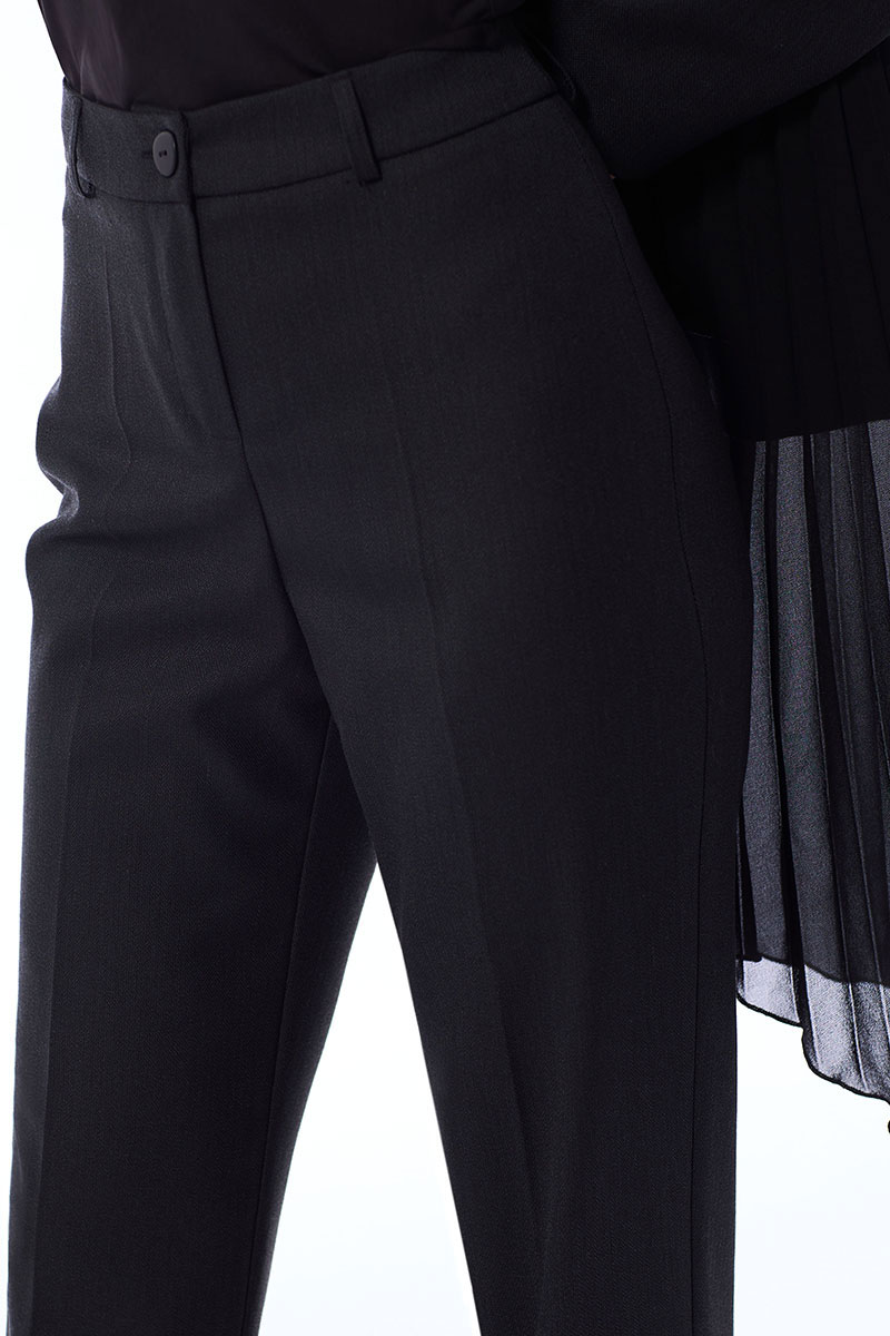 Брюки с отрезным поясом, на поясе расположены шлевки. Застежка гульфик.
