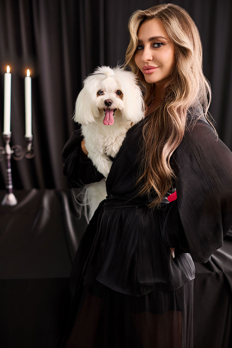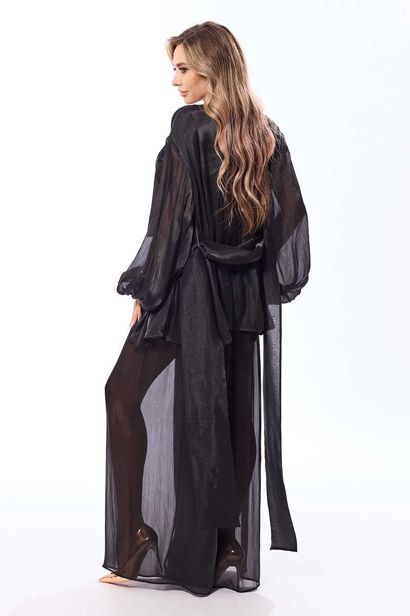 Туника без застежки, с отрезной планкой по борту и горловине спинки. Рукав втачной, длинный, с отрезной манжетой, присборенной на резинку. Туника со съемным поясом, по боковым швам расположены шлевки для пояса.
