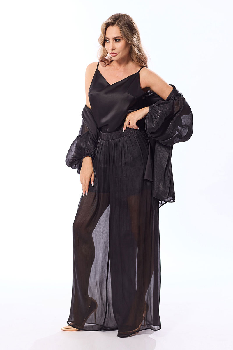 Брюки прямые, с отрезным поясом. Пояс присборен на резинку.