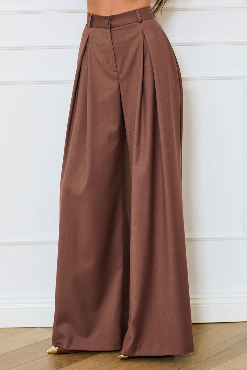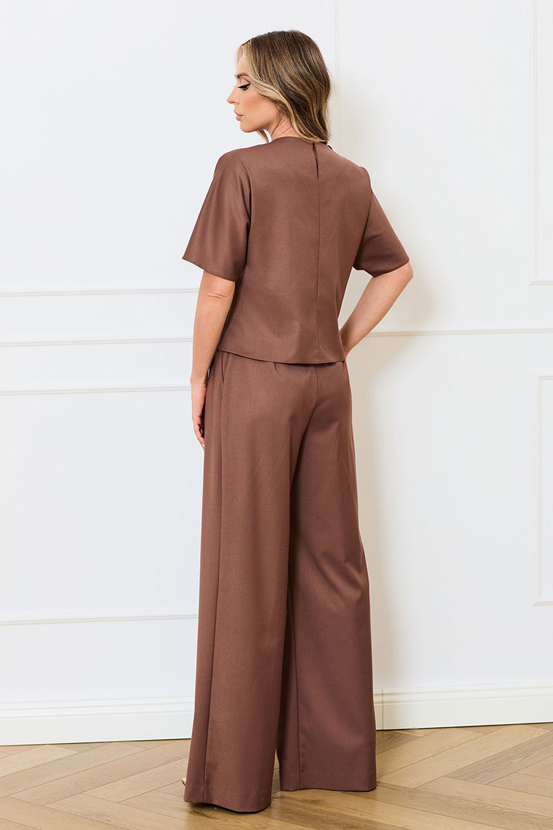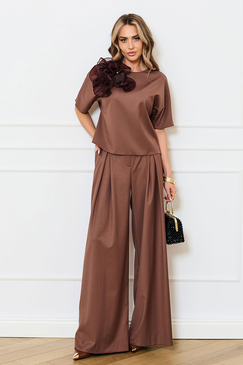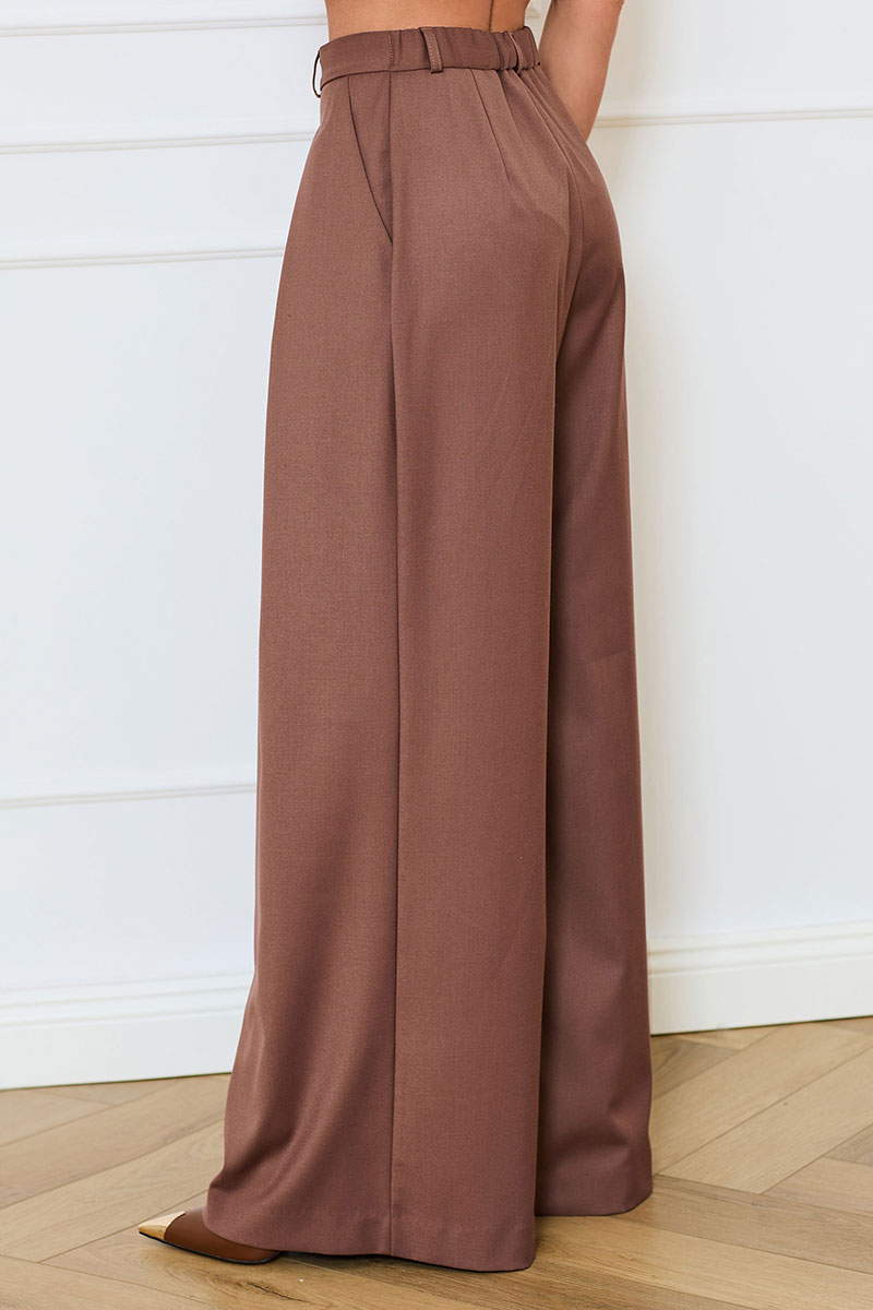 Брюки расширенного силуэта, с отрезным поясом, застежкой- гульфик. Пояс в области спинки присборен на резинку. В боковых швах расположены карманы. Вход в карман наклонный к боковому шву.