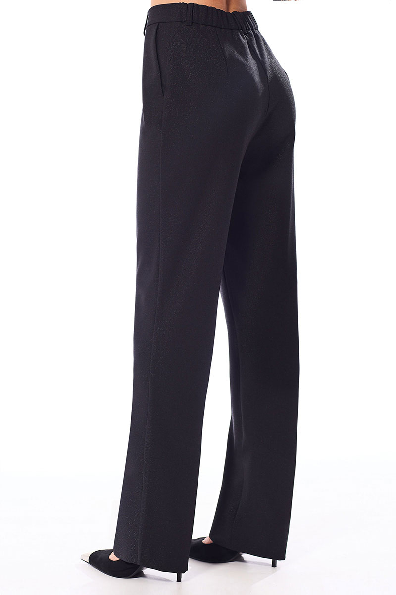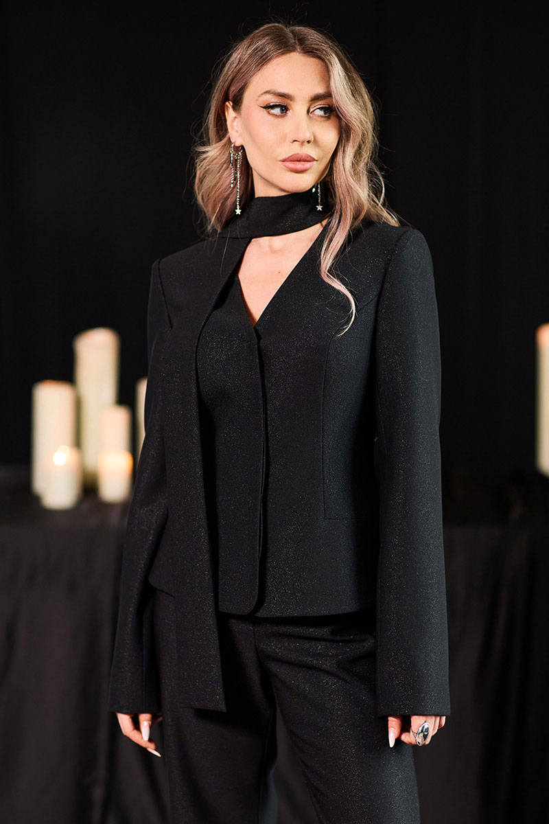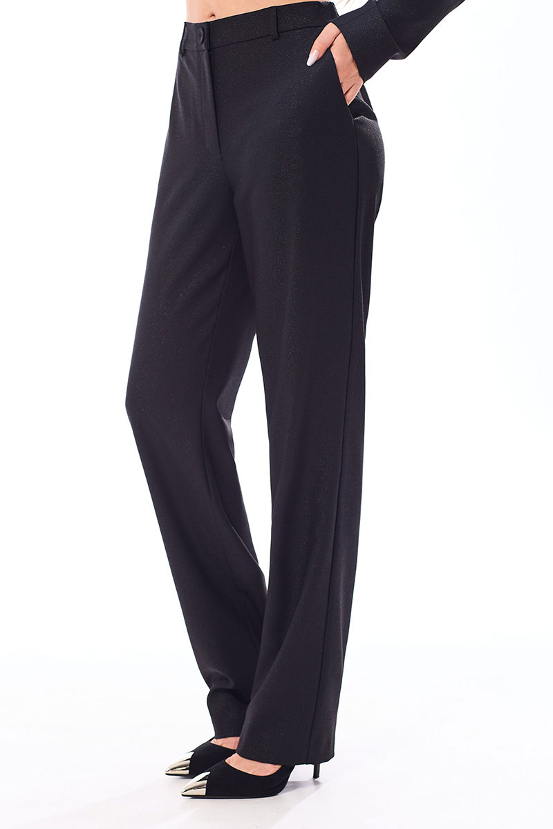 Описание внешнего вида: Жакет с центральной потайной застежкой на петли и пуговицы, без воротника, с V-образным вырезом горловины. По переду с рельефами, выходящими из проймы и входящими в боковой шов. По спинке с рельефами, выходящими из проймы. По н6изу спинки- баска. Рукав втачной, длинный. Брюки-с отрезым поясом, на поясе расположены шлевки. В области спинки пояс присборен на резинку. Застежка гульфик. Передние половинки с карманами. Вход в карман наклонный к боковому шву.