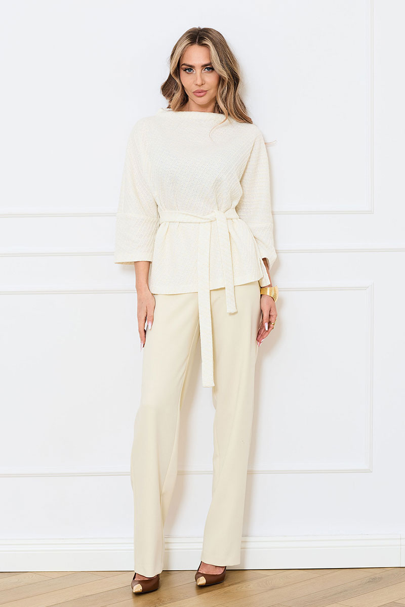 Блузон с цельнокроенным воротником- хомут. Перед с нагрудными вытачками. Спинка со средним швом. Рукав короткий, плечо спущенное. Блузка со съемным поясом.