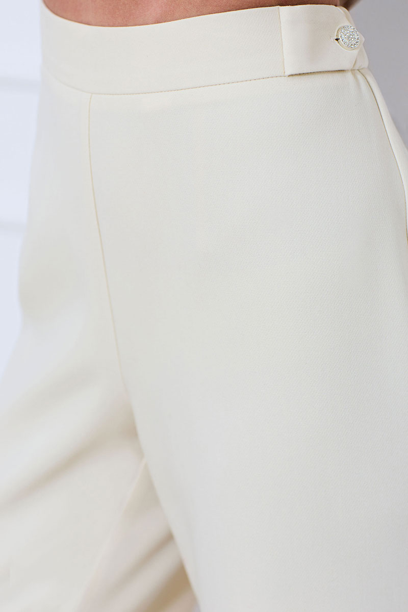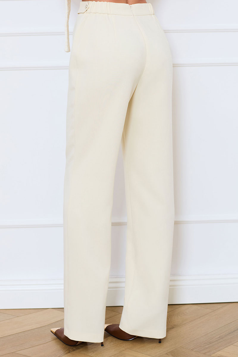 Брюки с отрезным поясом, в области боковых швов пояс частично присборен на резинку. По боковым швам пояса- декоративные паты, закрепленные к поясу петлей и пуговицей. Застежка- гульфик.