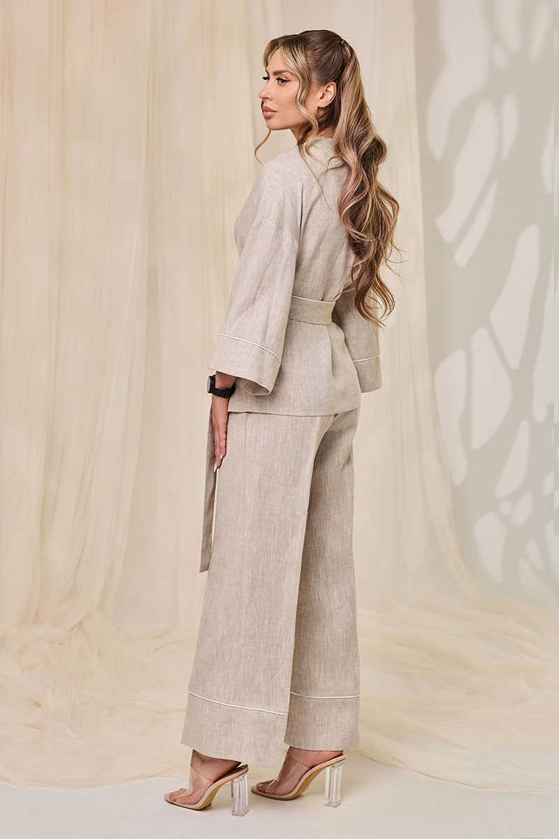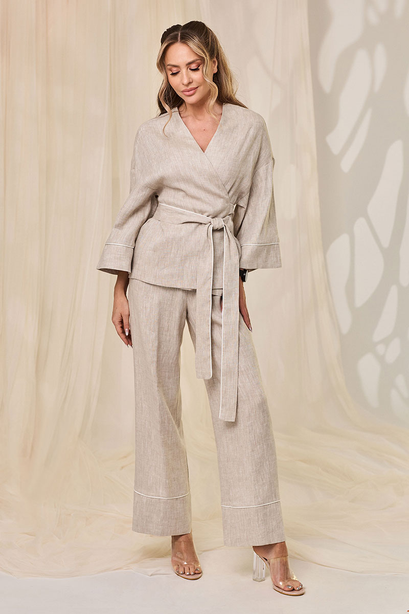 Блузка с фиксацией на завязки и пояс по линии талии, без воротника, с V-образным вырезом горловины. Полочки с запахом, на которых закреплены завязки. Спинка цельная. Плечо спущенное. Рукав втачной, ?, с отрезной манжетой. Брюки с отрезным поясом. Пояс присборен на резинку. Низ брюк с отрезными манжетами По шву притачивания манжет брюк, манжет рукавов, поясу- втачной кант , контрастный основной ткани.