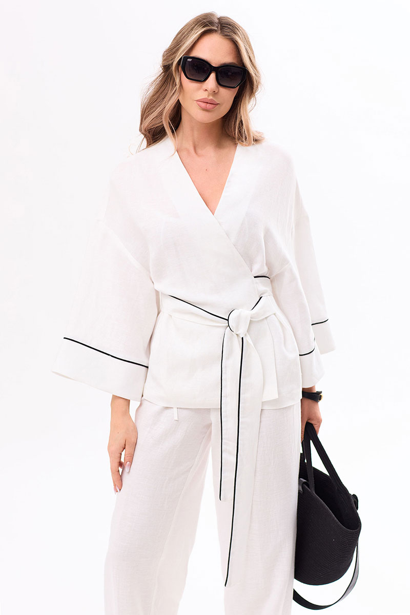 Блузка с фиксацией на завязки и пояс по линии талии, без воротника, с V-образным вырезом горловины. Полочки с запахом, на которых закреплены завязки. Спинка цельная. Плечо спущенное. Рукав втачной, ?, с отрезной манжетой. Брюки с отрезным поясом. Пояс присборен на резинку. Низ брюк с отрезными манжетами По шву притачивания манжет брюк, манжет рукавов, поясу- втачной кант , контрастный основной ткани.