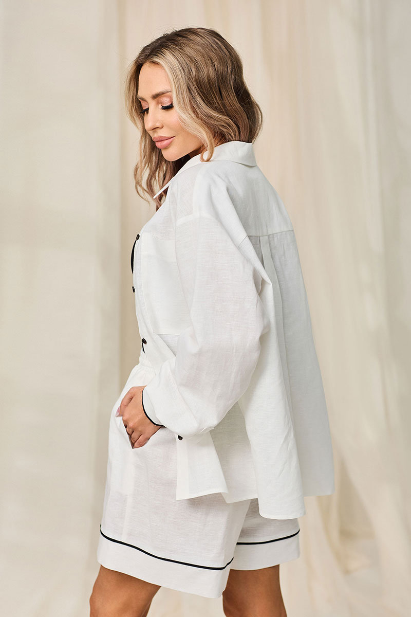 Блузка с центральной застежкой на петли и пуговицы, втачным воротником с отрезной стойкой На левой полочке-накладной карман, расположенный на уровне груди. Спинка с отрезной кокеткой, бантовой складкой, расположенной по шву притачивания кокетки. Плечо спущенное. Рукав втачной, длинный, с отрезной манжетой, застегивающейся на две петли и пуговицы. Шорты с отрезным поясом. Пояс присборен на резинку. Низ шорт с отрезными манжетами. В боковых швах расположены карманы. По шву притачивания манжет шорт, низу манжет рукавов, - втачной кант , контрастный основной ткани.