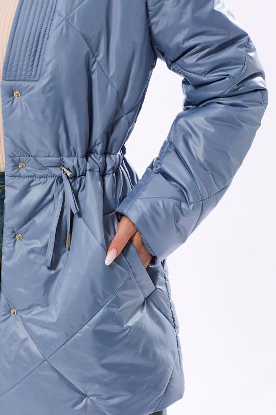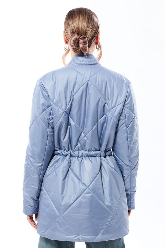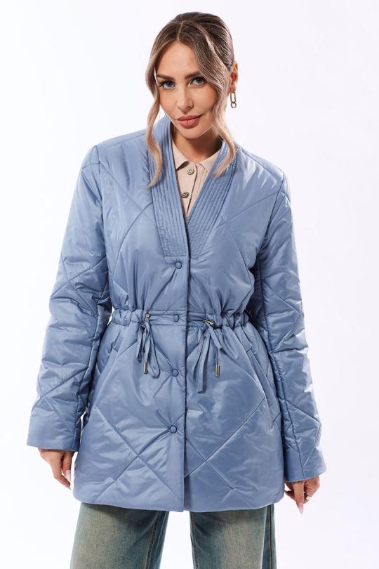 Куртка утепленная, с центральной застежкой на кнопки, втачным воротником, V-образным вырезом горловины. На полочках расположены прорезные карманы с листочками. На линии талии расположена кулиса со шнуром. Толщина синтепона 150г/м2, , изделие рекомендуется до -5 градусов.