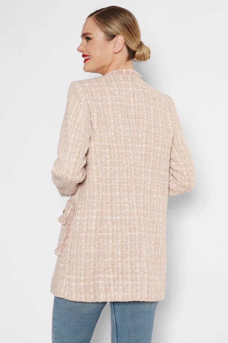 застежкой встык на 4 пришивных крючка, с отделочным элементом по борту и горловине - бахрома (из основной ткани). Жакет на подкладке с плечевыми накладками.