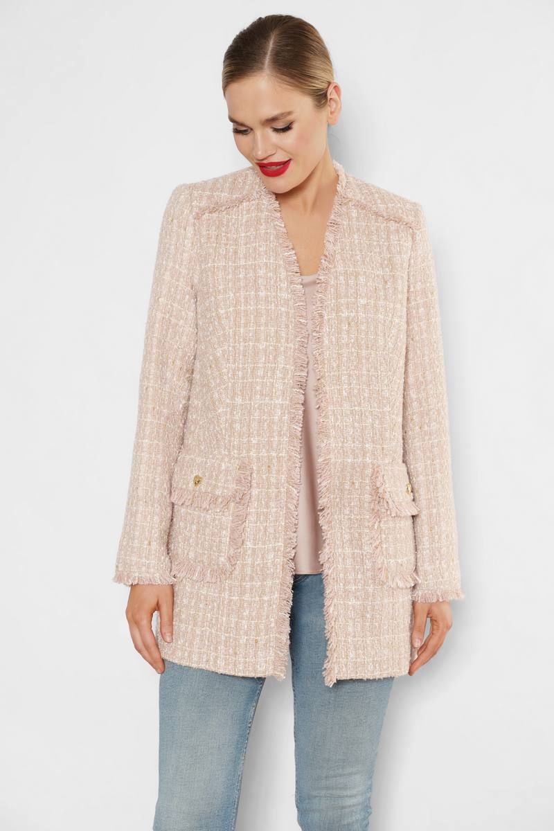 женщине, независимо от её возраста, предпочитаемого стиля одежды и телосложения. Жакет женский полуприлегающего силуэта из костюмно-плательной ткани типа Chanel с центральной бортовой
