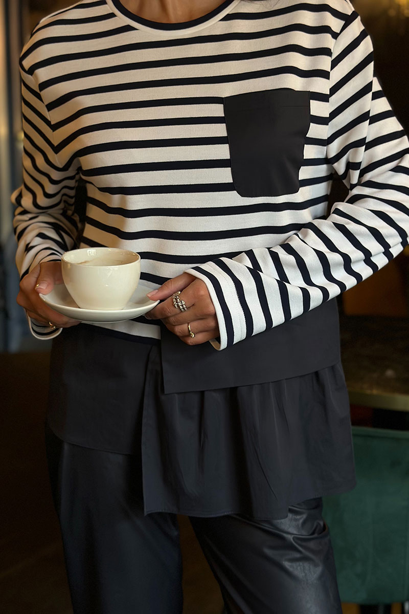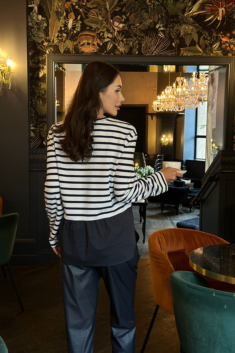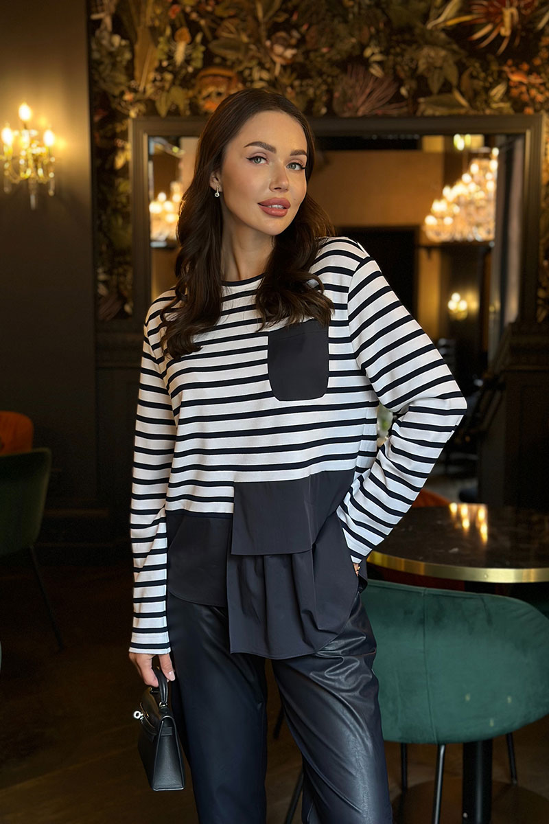 Джемпер женский прямого силуэта. Перед цельнокроеный с нагрудным карманом слева из ткани-компаньона. Спинка цельнокроеная. По низу джемпер обработан баской из ткани-компаньона. Плечо спущено, рукав длинный, одношовный. Горловина округлой формы, обработан притачной бейкой.Цвет материала может отличаться по тону в зависимости от настроек вашего монитора!