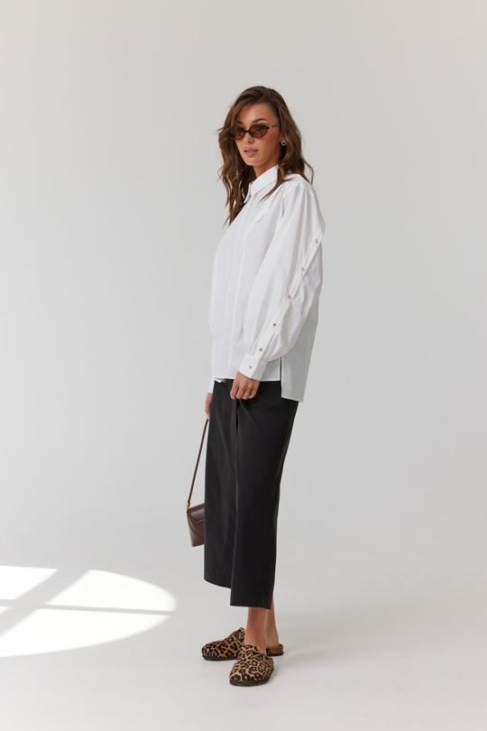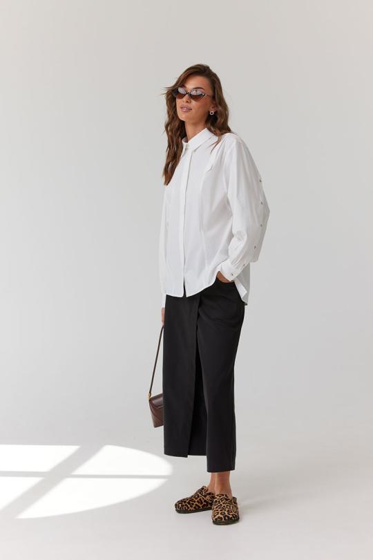 Блузка женская прямая с центральной потайной застежкой на петли и пуговицы. Перед с отстрочными рельефами, в которых вставлен декоративный элемент в виде планки из основной ткани. Спинка цельнокроеная. В боковых швах обработаны разрезы. Низ ассиметричный, перед короче спинки. Пройма углублена и слегка спущена. Рукав типа «летучая мышь» с функциональной застежкой по всей длине рукава со стороны спинки на петли и декоративные пуговицы. Низ рукава присборен и обработан притачной манжетой, застегивающейся на петлю и пуговицу. По горловине воротник рубашечного типа с отрезной стойкой.