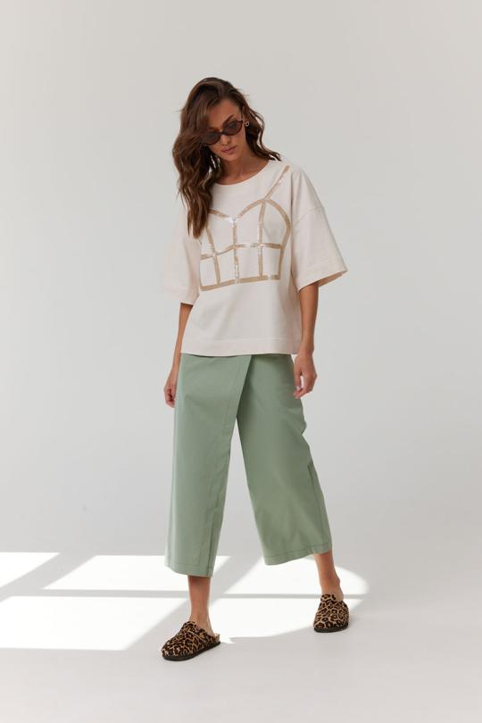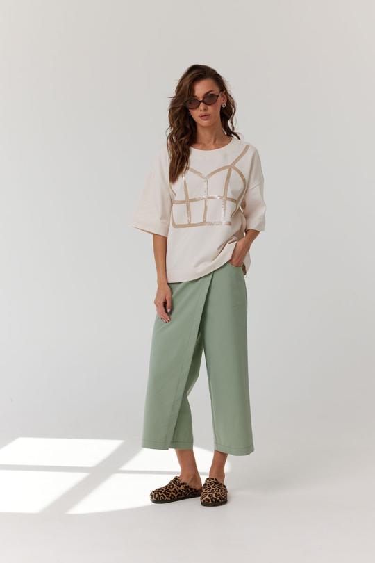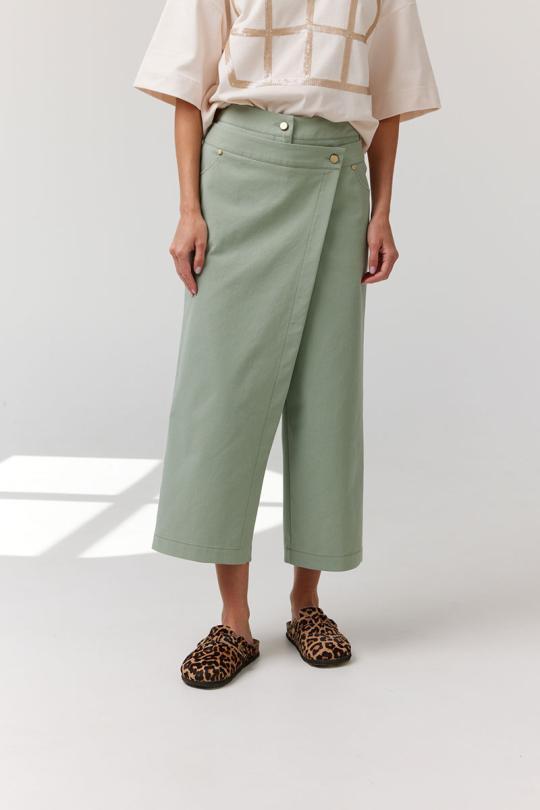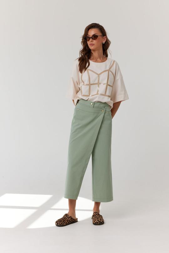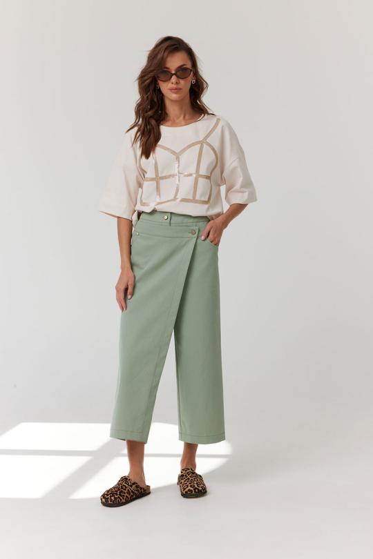Брюки укороченные, прямые с запахом. По переду обработаны карманы с фигурным входом, декорированные металлическими хольнитенами и застежка на молнию. По задним половинкам брюк обработаны вытачки. Верх брюк обработан притачным поясом, застегивающимся на петлю и пуговицу. Верх запашной части обработан вторым притачным поясом, застегивающимся на петлю и пуговицу.