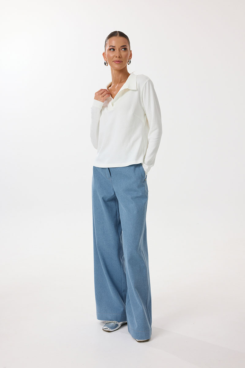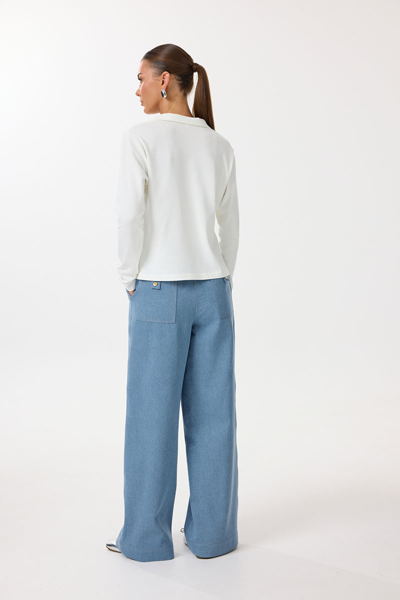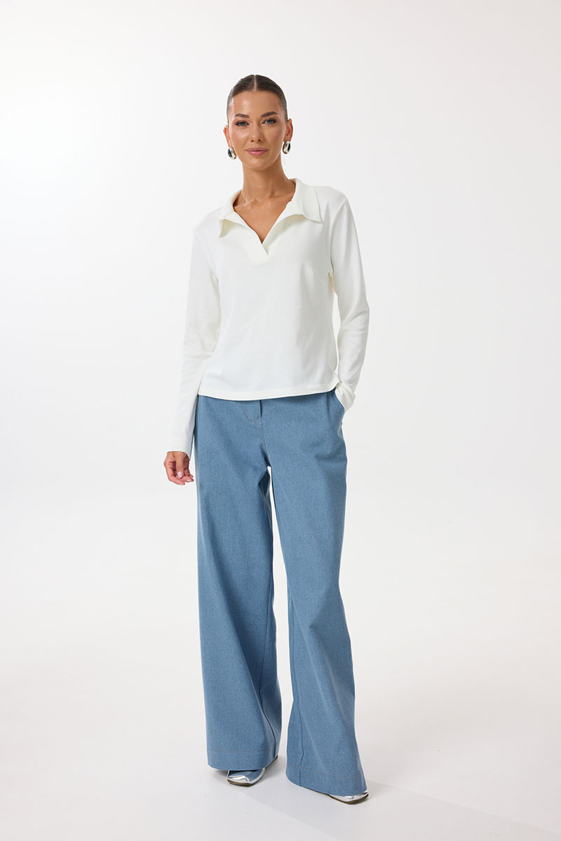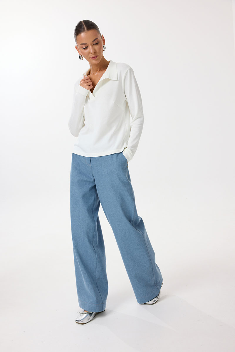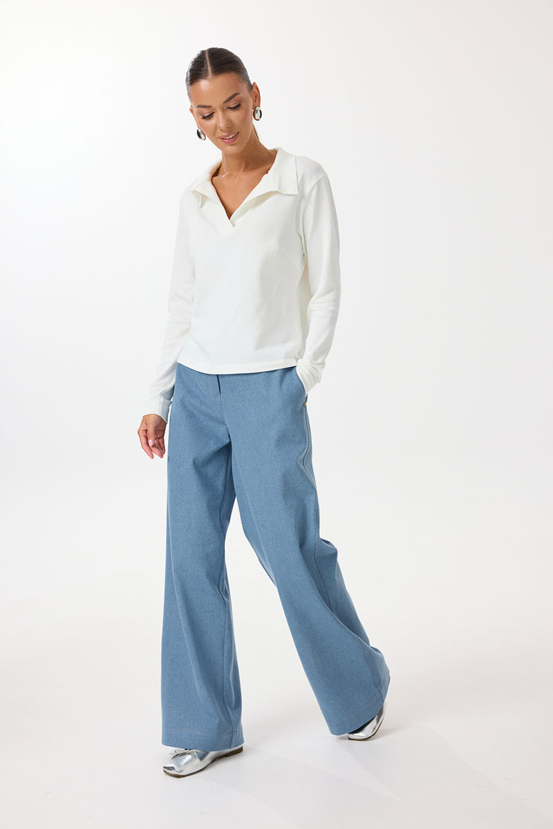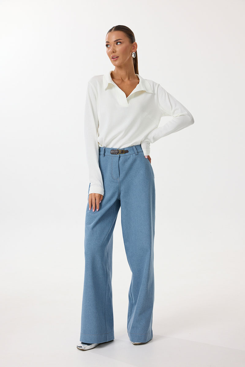 Блузка женская прямого силуэта. По переду обработаны вытачки, застежка притачными планками. Спинка цельнокроеная. По горловине воротник с цельнокроеной стойкой. Рукав длинный одношовный. Воротник и планка выполнены из ткани-компаньона.
