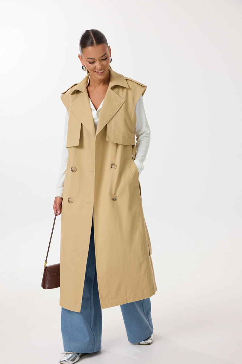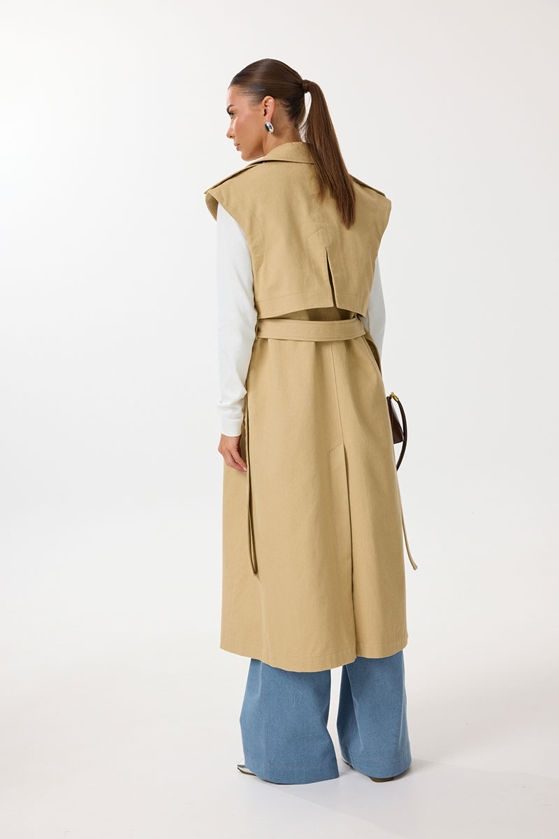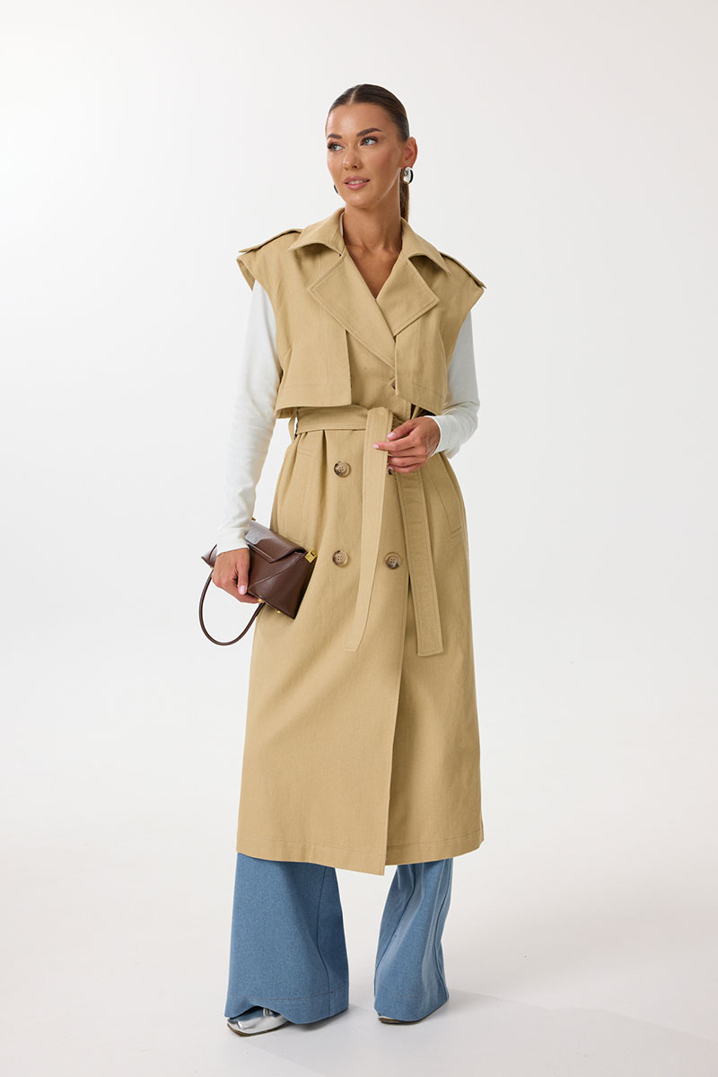 Жилет удлиненный прямого силуэта с центральной двубортной застежкой на петли и пуговицы. По переду обработаны нагрудные вытачки, карманы с наклонным входом с листочкой. Спинка со средним швом, в котором обработана шлица. По спинке и переду выполнены отлетные кокетки с отделочными строчками контрастного цвета. В области талии расположены широкие шлевки для пояса из основной ткани, которым комплектуется жилет. По горловине воротник с отрезной стойкой. В области плечевых швов расположены декоративные паты с пуговицами. Все отделочные строчки выполнены гарусной нитью контрастного цвета.