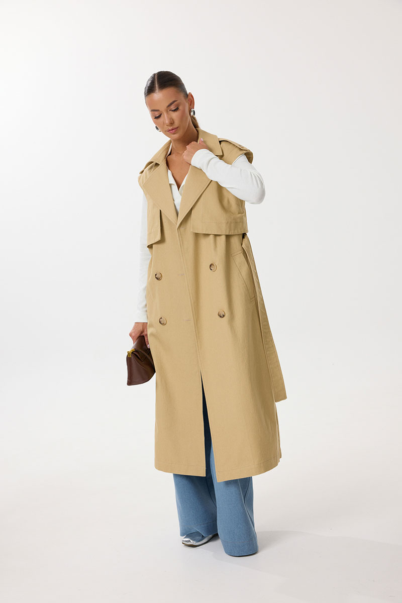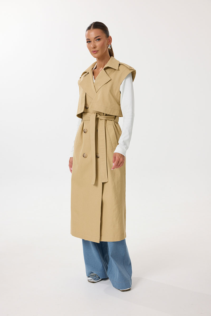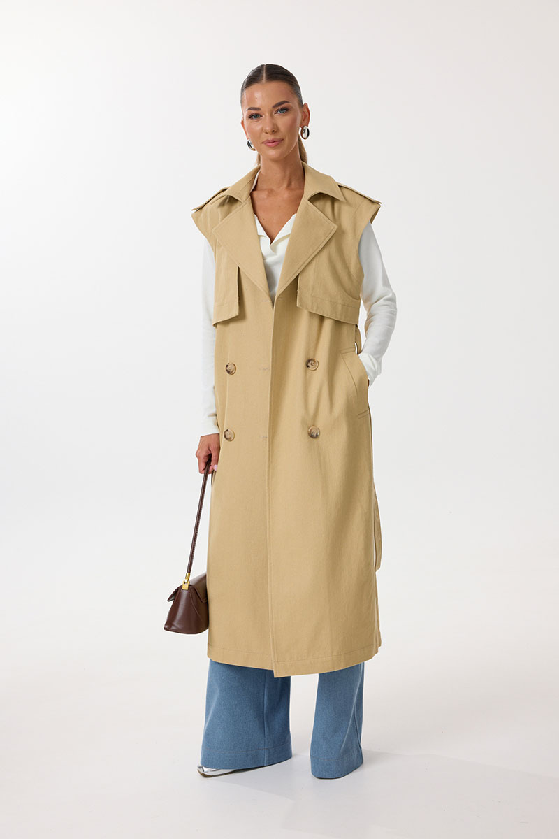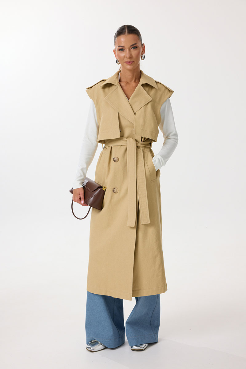Жилет удлиненный прямого силуэта с центральной двубортной застежкой на петли и пуговицы. По переду обработаны нагрудные вытачки, карманы с наклонным входом с листочкой. Спинка со средним швом, в котором обработана шлица. По спинке и переду выполнены отлетные кокетки с отделочными строчками контрастного цвета. В области талии расположены широкие шлевки для пояса из основной ткани, которым комплектуется жилет. По горловине воротник с отрезной стойкой. В области плечевых швов расположены декоративные паты с пуговицами. Все отделочные строчки выполнены гарусной нитью контрастного цвета.