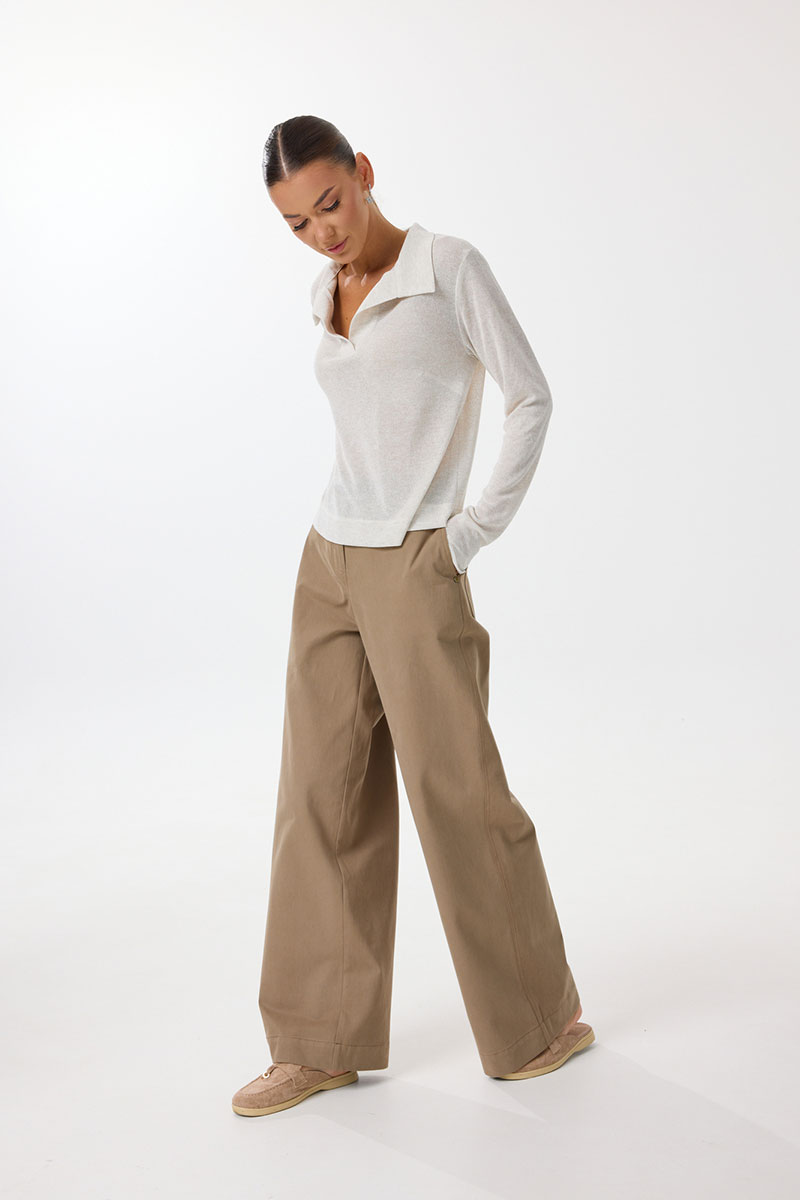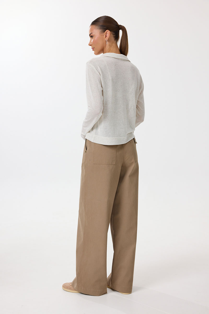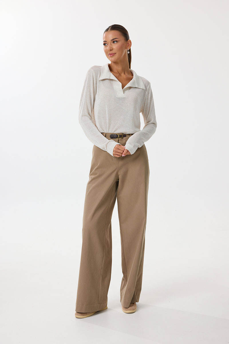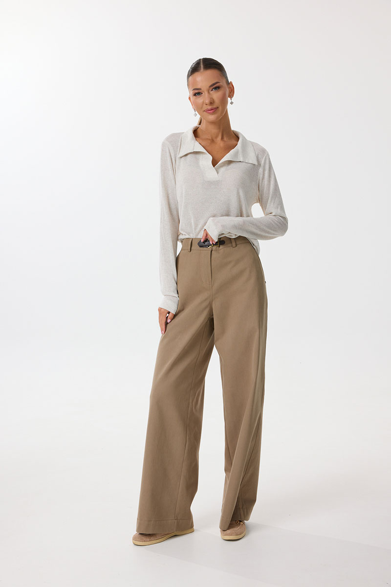 Блузка женская прямого силуэта. По переду обработаны вытачки, застежка притачными планками. Спинка цельнокроеная. По горловине воротник с цельнокроеной стойкой. Рукав длинный одношовный. Воротник и планка выполнены из ткани-компаньона.