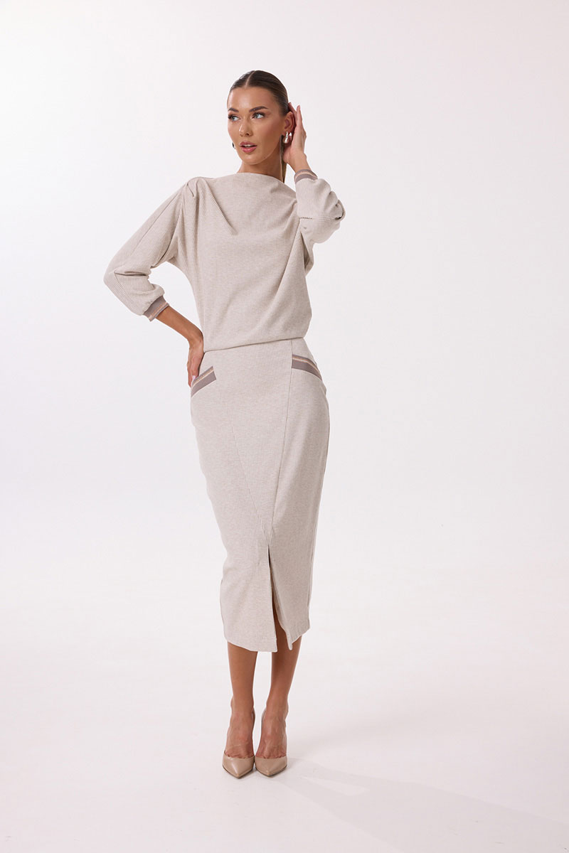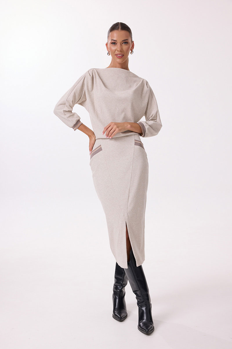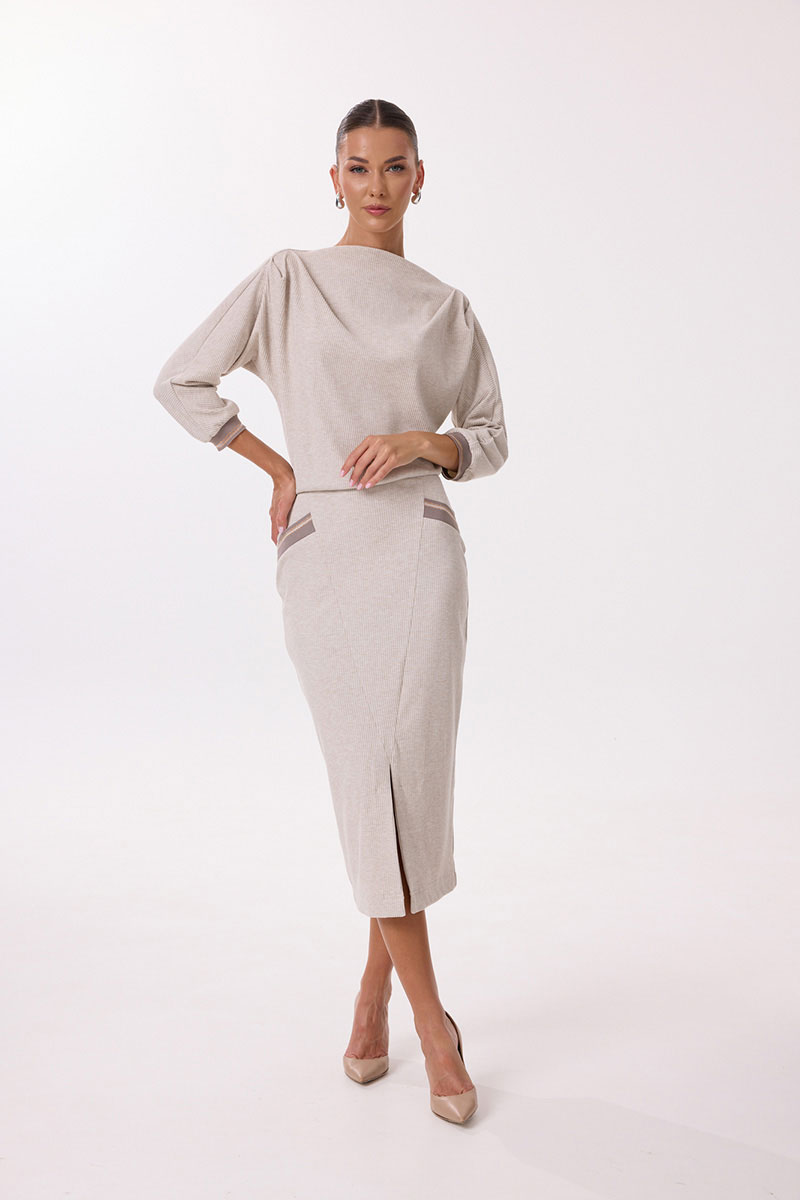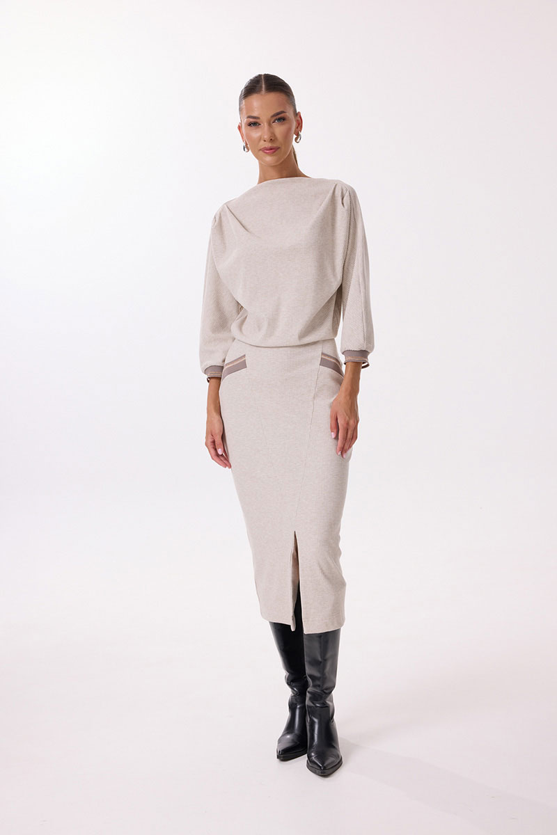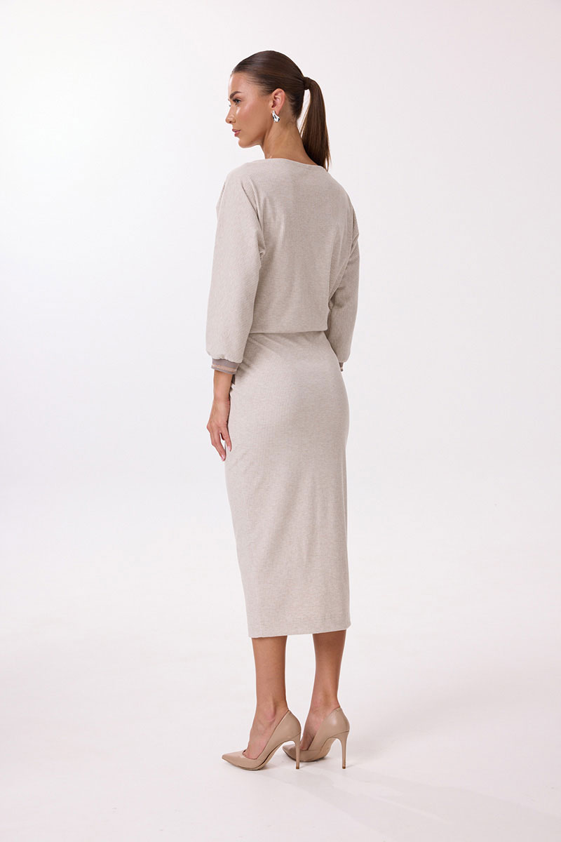 Платье женское полуприлегающего силуэта, отрезное по линии талии. Лиф платья кроя «летучая мышь». Перед лифа цельнокроеный. Спинка лифа цельнокроеная. Горловина лодочкообразной формы. В области плечевых швов застрочены защипы для формирования складок по переду. Низ рукавов обработан притачной манжетой из ткани-компаньона. Перед юбки с декоративными подрезами и имитацией прорезных карманов с листочкой из ткани-компаньона, обработан разрез. Заднее полотнище юбки цельнокроеное.