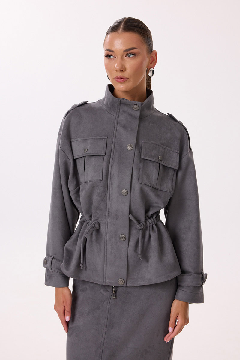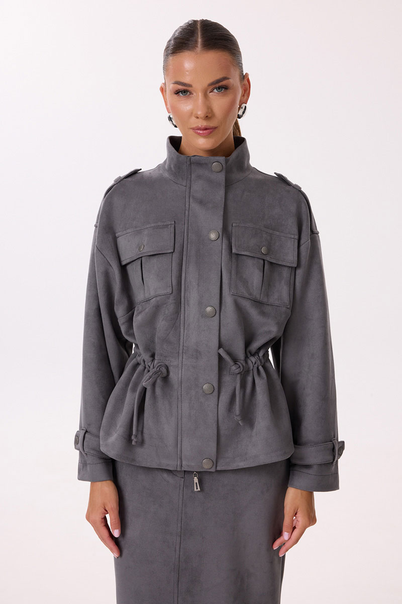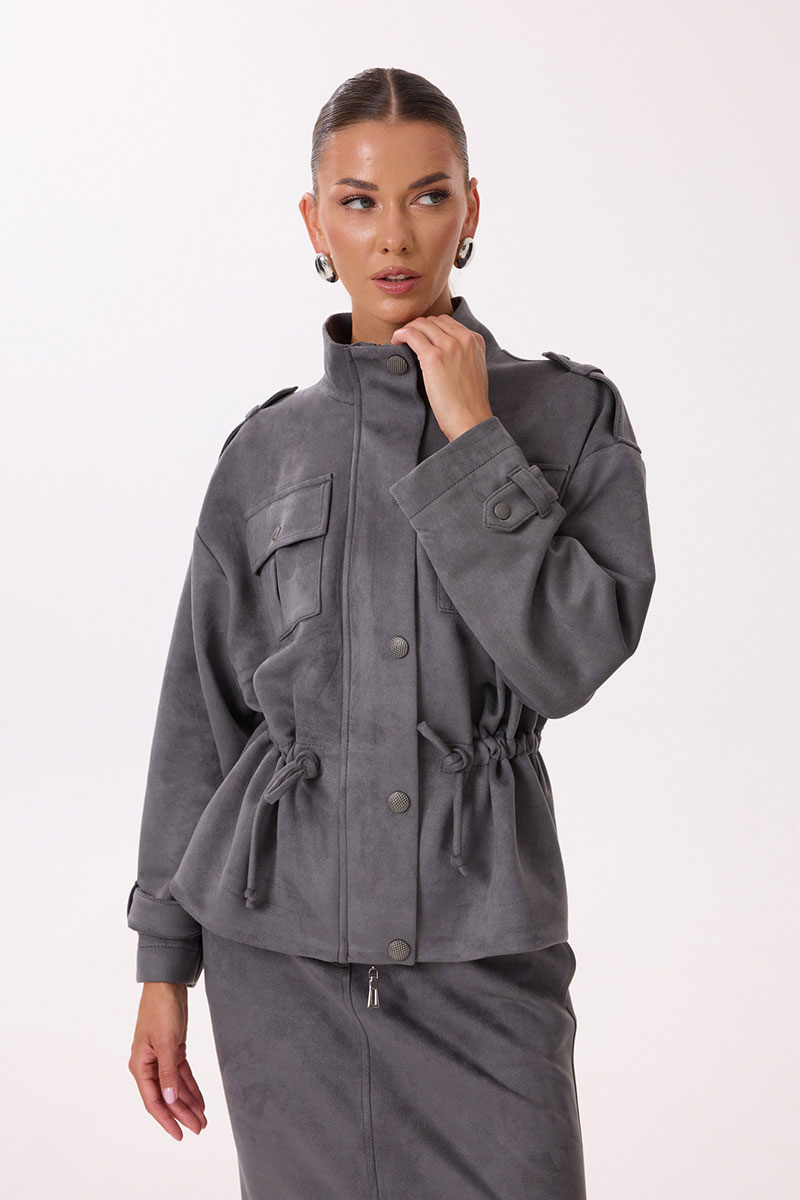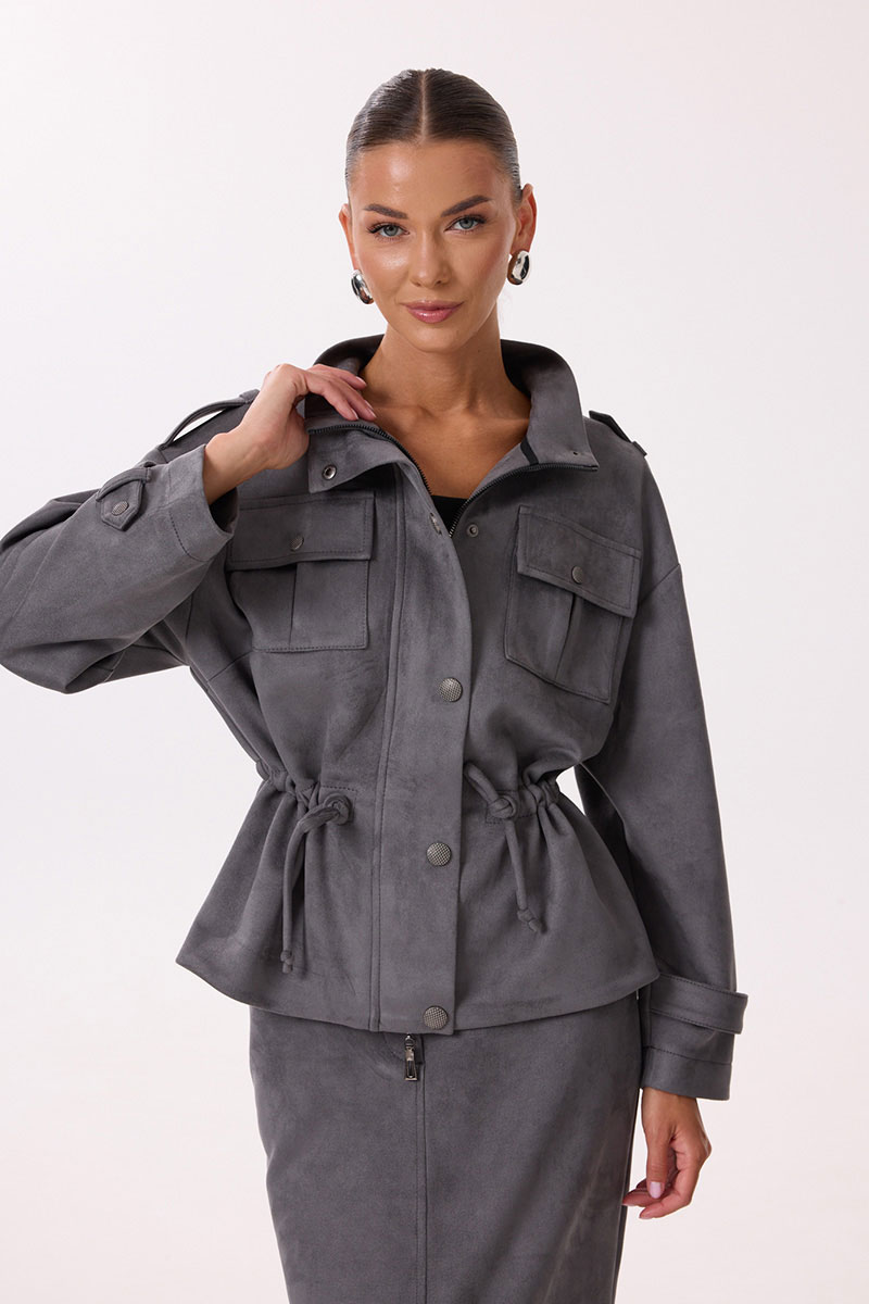 Жакет прямого силуэта с центральной застежкой на молнию. Перед с нагрудными накладными карманами с клапаном, застегивающимся на кнопку, обработана притачная планка с кнопками, закрывающая застежку. Спинка цельнокроеная. Плечо спущено, обработана декоративная пата с кнопкой. Рукав длинный одношовный, по низу декорирован патой с кнопкой. В области талии расположена кулиса для регулирования степени прилегания. Горловина обработана притачной стойкой.