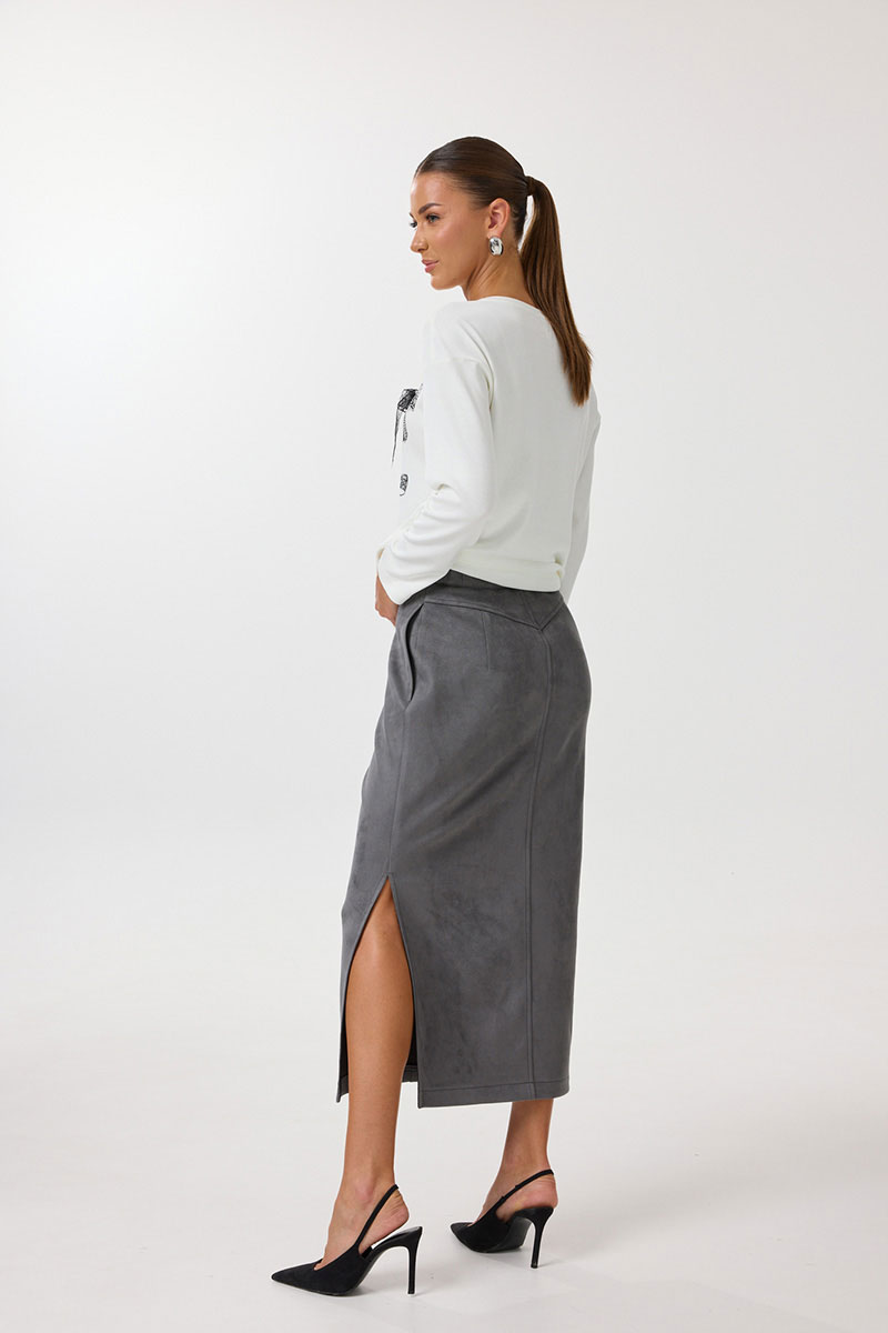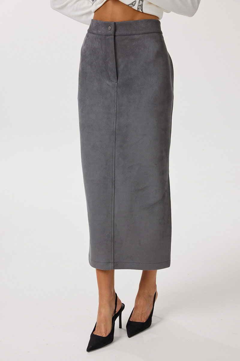 Юбка женская прямого силуэта. Перед со средним швом, в котором обработана застежка на молнию. Задняя половинка юбки со средним швом и кокеткой. В боковых швах обработаны карманы, в левом по низу разрез. Верх обработан притачным поясом (частично на резинке), застегивающимся на кнопку.