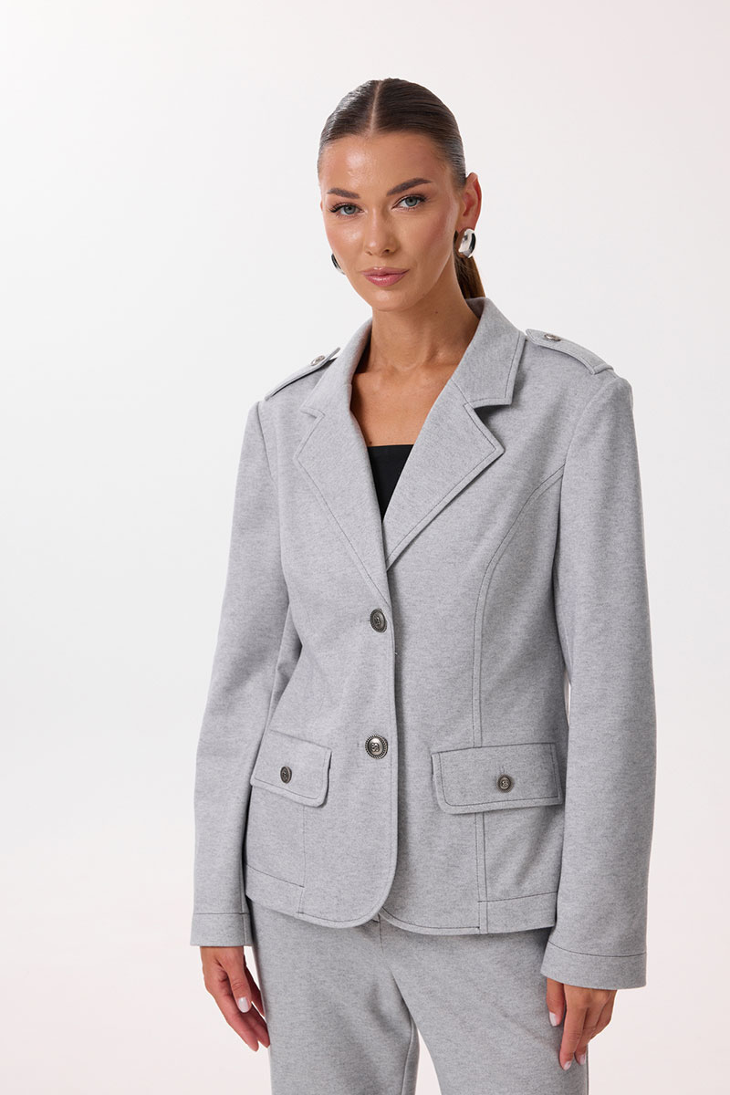 Жакет женский прилегающего силуэта, с центральной бортовой застежкой на петли и пуговицы. По переду обработаны рельефы, прорезные карманы с листочкой и клапаном, застегивающиеся на петлю и пуговицу. Спинка с рельефами и средним швом, в котором обработана шлица. Воротник с отрезной стойкой. Декоративные паты с пуговицей по плечевым швам. Рукав двухшовный, длинный с имитацией шлицы, которая декорирована пуговицами. Все отделочные строчки выполнены гарусной нитью контрастного цвета.