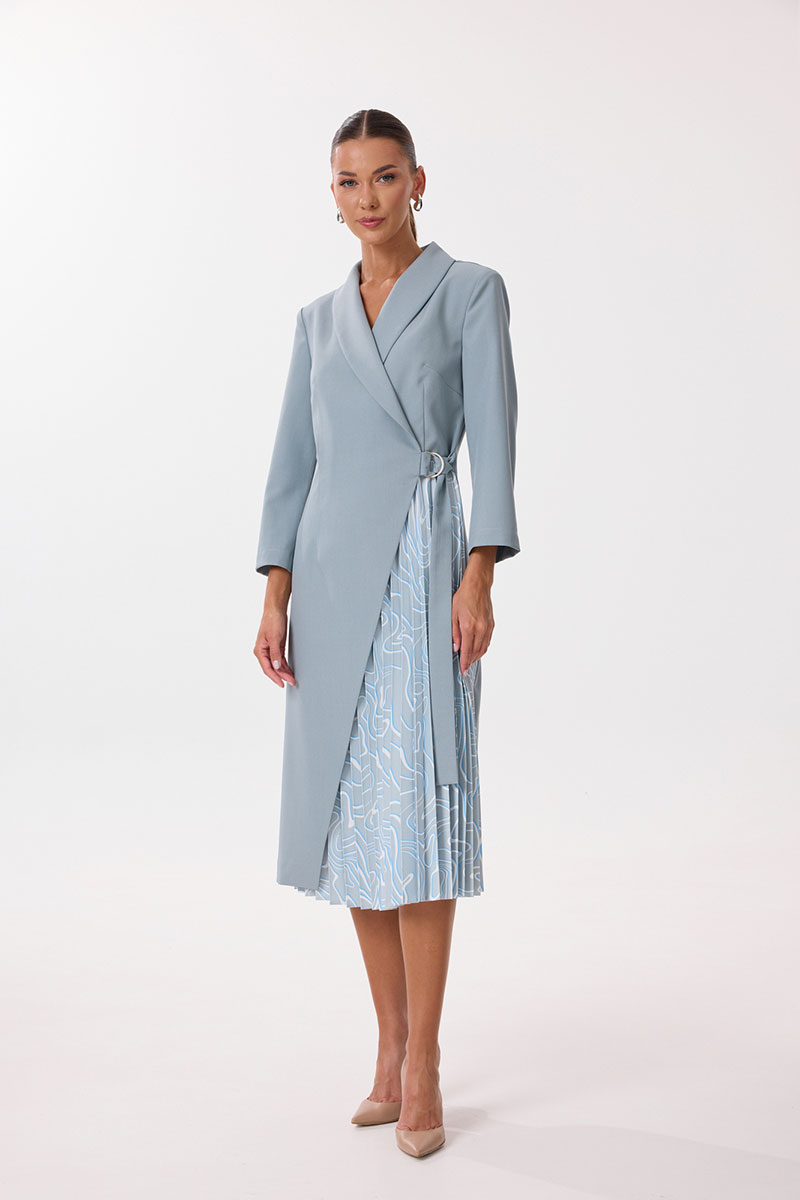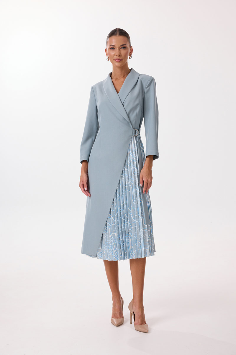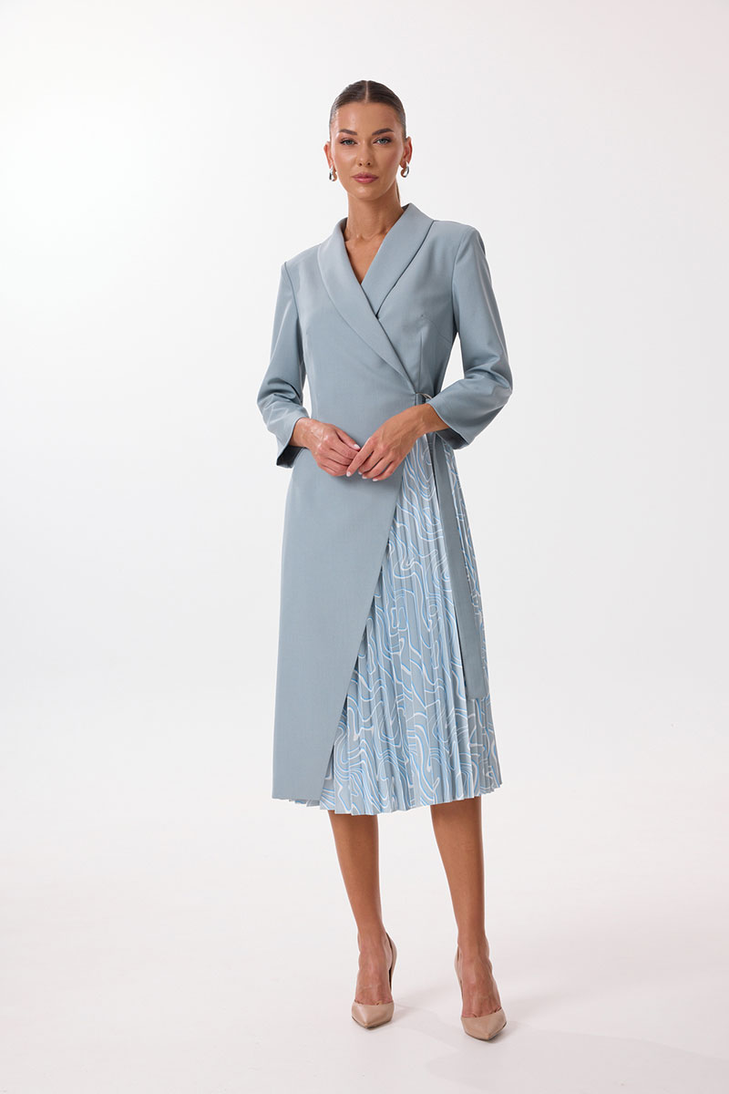 Платье женское из двух видов ткани, полуприлегающего силуэта. Перед комбинированный на запах с поясом. По переду нагрудные и талиевые вытачки. Горловина обработана воротником шалевого типа. Передняя половина юбки выполнена из ткани-компаньона с радиальным гофрированием. В боковом шве справа потайная молния. В области талии слева расположен притачной пояс из основной ткани, завязывающийся на полукольца. Спинка цельнокроеная с плечевыми и талиевыми вытачками. Рукав 7/8 втачной одношовный.