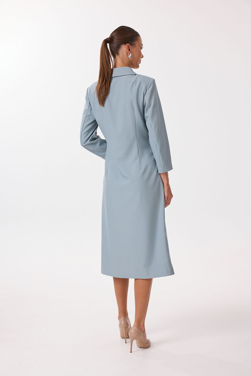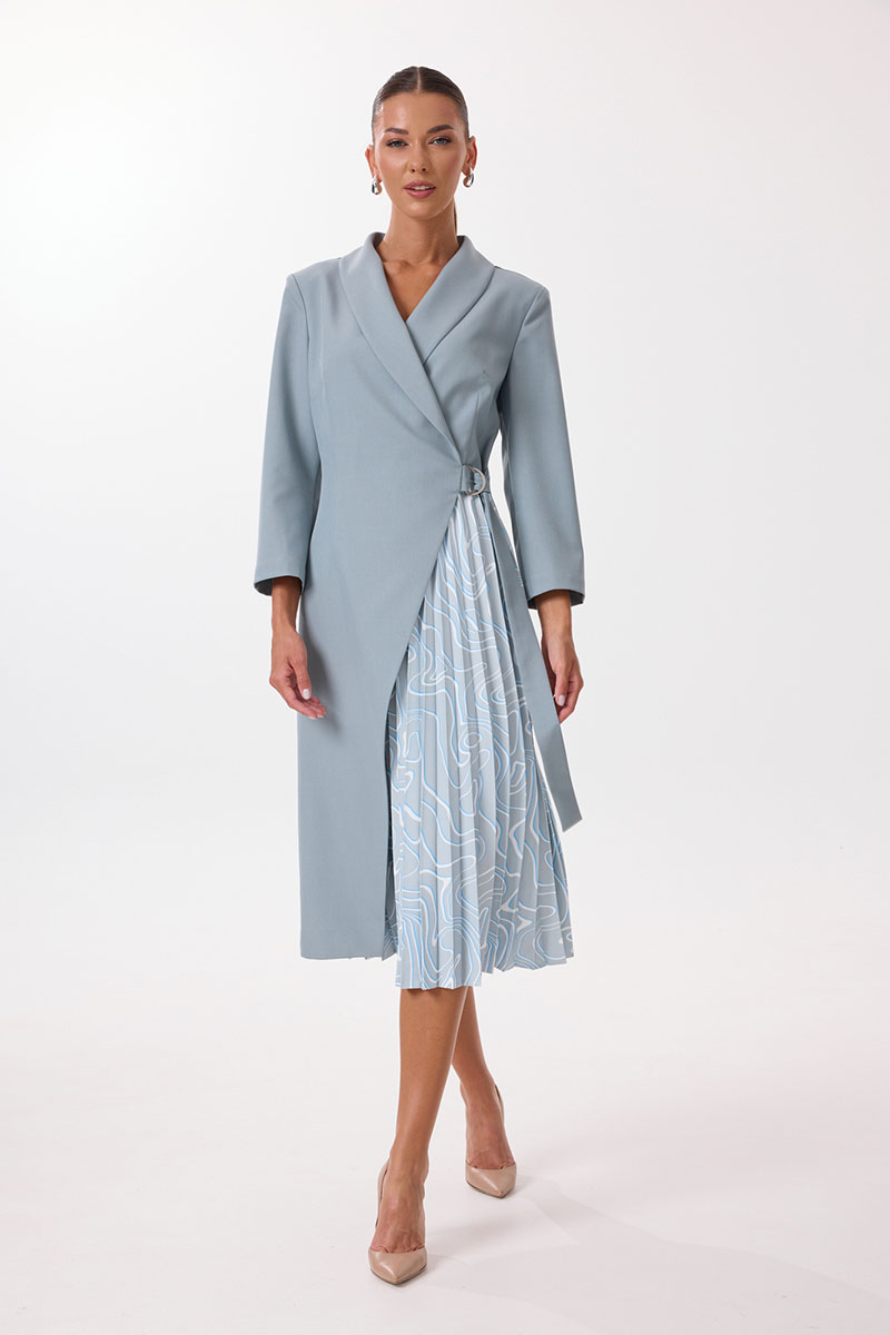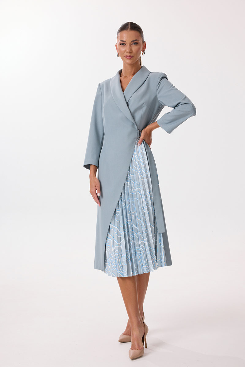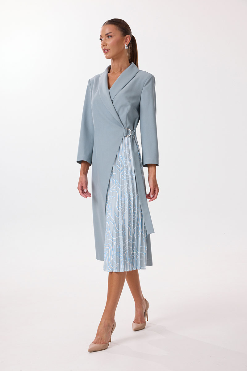 Платье женское из двух видов ткани, полуприлегающего силуэта. Перед комбинированный на запах с поясом. По переду нагрудные и талиевые вытачки. Горловина обработана воротником шалевого типа. Передняя половина юбки выполнена из ткани-компаньона с радиальным гофрированием. В боковом шве справа потайная молния. В области талии слева расположен притачной пояс из основной ткани, завязывающийся на полукольца. Спинка цельнокроеная с плечевыми и талиевыми вытачками. Рукав 7/8 втачной одношовный.