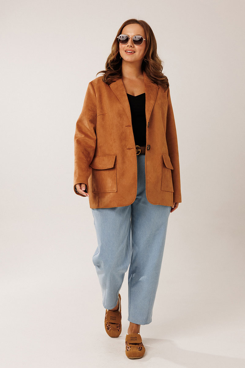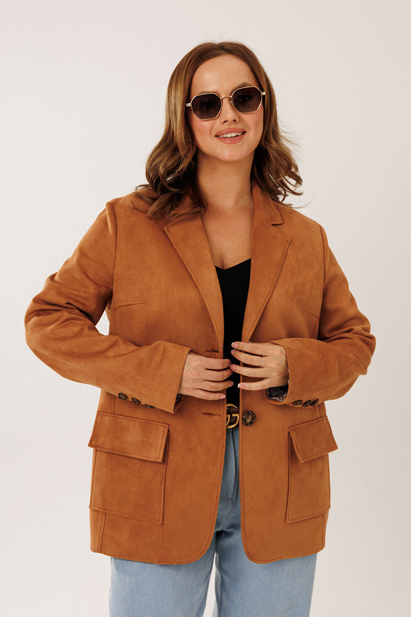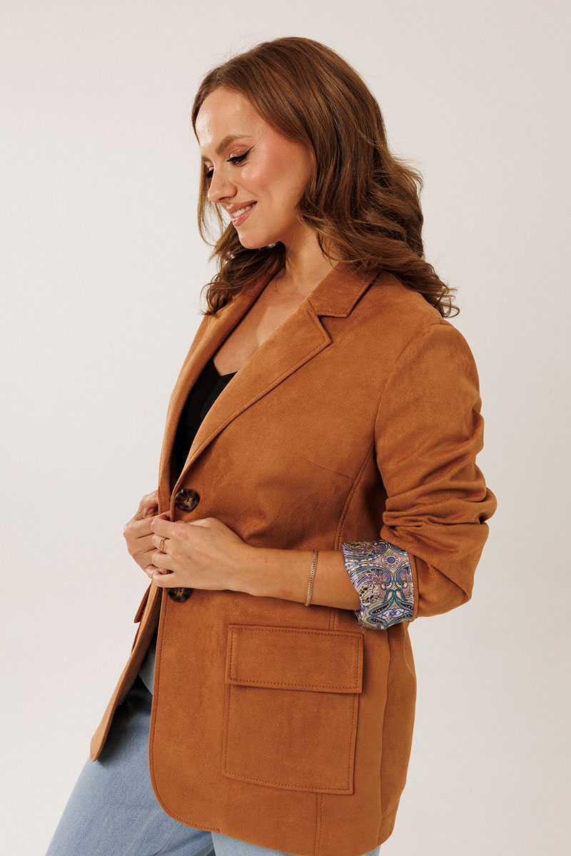 Жакет женский прямого силуэта на частичной подкладке. Жакет однобортный, длинной до середины бедра. Полочка с отрезными бочками и вытачкой. На нижней части полочки настрочены накладные карманы с клапаном. Спинка с отрезными бочками и отрезной кокеткой Рукав втачной, полной длинны. По низу рукава обработана имитация шлицы с отделочными декоративными пуговицами. Воротник в жакете втачной с отрезной стойкой и лацканами. Линия низа борта полочки скруглена. Жакет застегивается на петли пуговицы. По воротнику, лацкану, борту, карманам и швам спинки прострочены отделочные строчки. Полочки, кокетка спинки и рукава с контрастной подкладкой.Декоративные элементы и фурнитура могут отличаться от заявленных на фото. Цвет материала может отличаться по тону в зависимости от настроек вашего монитора!