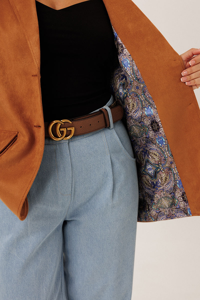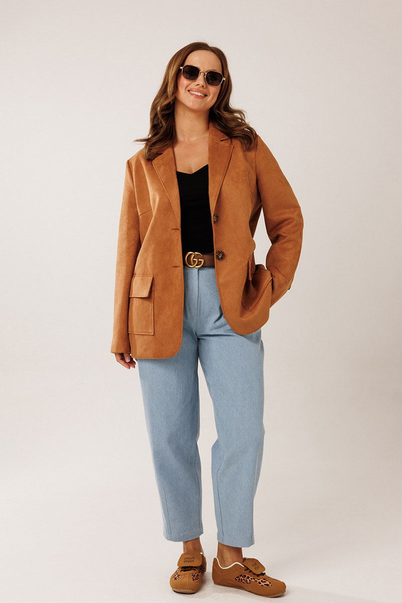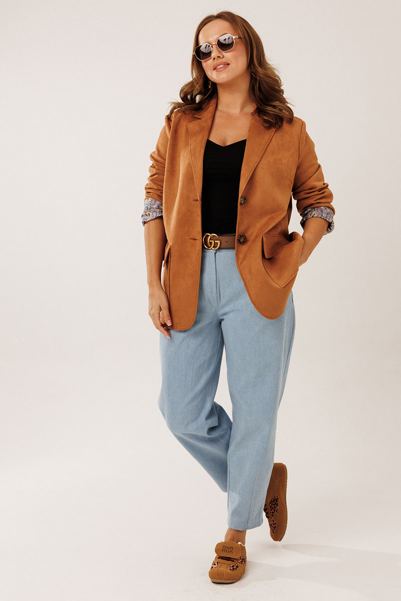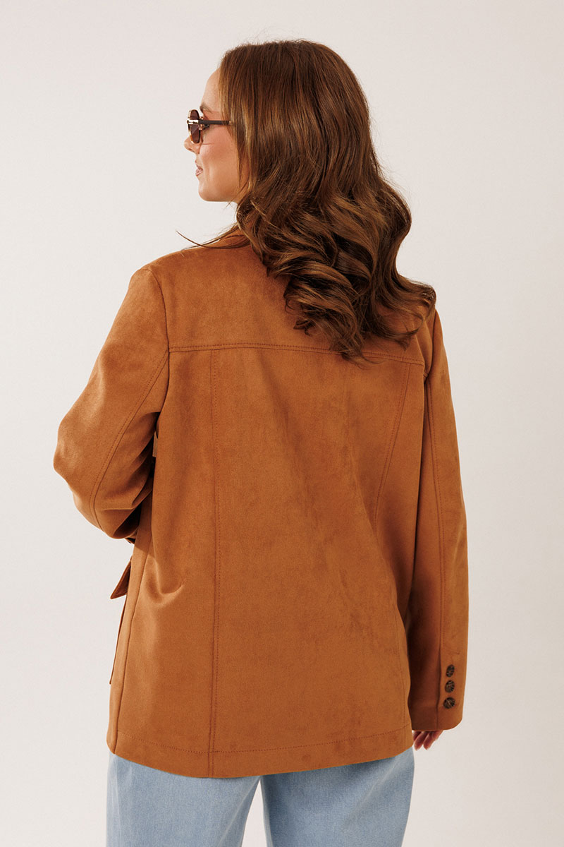 Жакет женский прямого силуэта на частичной подкладке. Жакет однобортный, длинной до середины бедра. Полочка с отрезными бочками и вытачкой. На нижней части полочки настрочены накладные карманы с клапаном. Спинка с отрезными бочками и отрезной кокеткой Рукав втачной, полной длинны. По низу рукава обработана имитация шлицы с отделочными декоративными пуговицами. Воротник в жакете втачной с отрезной стойкой и лацканами. Линия низа борта полочки скруглена. Жакет застегивается на петли пуговицы. По воротнику, лацкану, борту, карманам и швам спинки прострочены отделочные строчки. Полочки, кокетка спинки и рукава с контрастной подкладкой.Декоративные элементы и фурнитура могут отличаться от заявленных на фото. Цвет материала может отличаться по тону в зависимости от настроек вашего монитора!