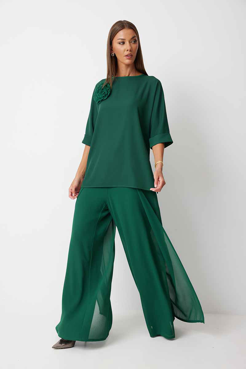 Брюки прямого силуэта, выполнены из шифоновой ткани на подкладке полной длинны. Боковой шов брюк открыт. Синка брюк заходит на перед по верхней части. Подкладка из не просвещающейся креповой ткани. Верх брюк обработан отрезным поясом. Центральная часть пояса без резинки, остальной пояс на резинке. Низ брюк обработан швом « в подгибку».
