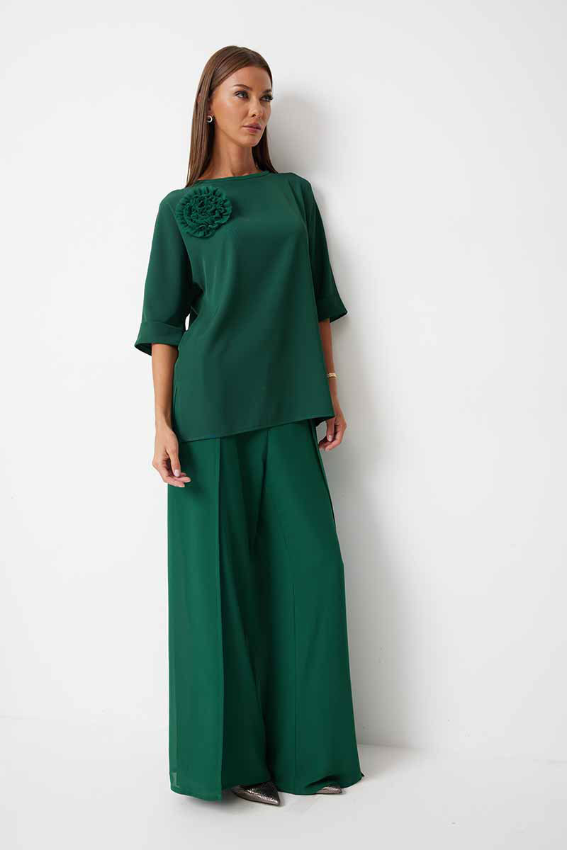 Блуза женская прямого силуэта закрывающая линию паха с цельнокроеными рукавами. К блузке прилагается съёмный декор – цветок. По боковым швам располагаются разрезы. Спинка с центральным швом и застежкой на навесную петлю и пуговицу. Горловина обработана косой бейкой. Рукав до локтя, низ рукава обработан отрезной отворачивающейся манжетой, закрепленной по швам. Низ блузки обработан швом «в подгибку».