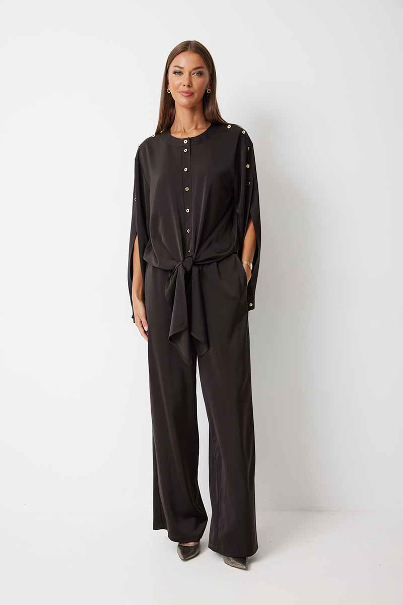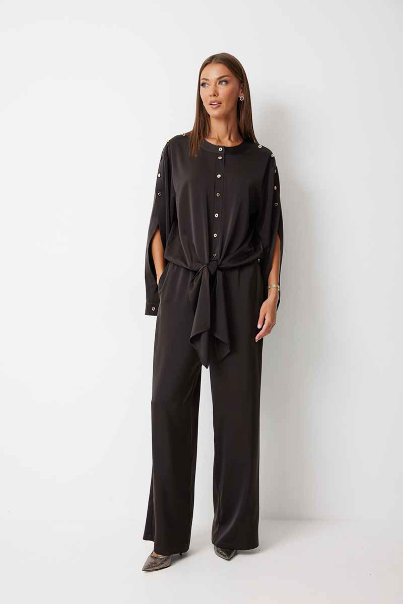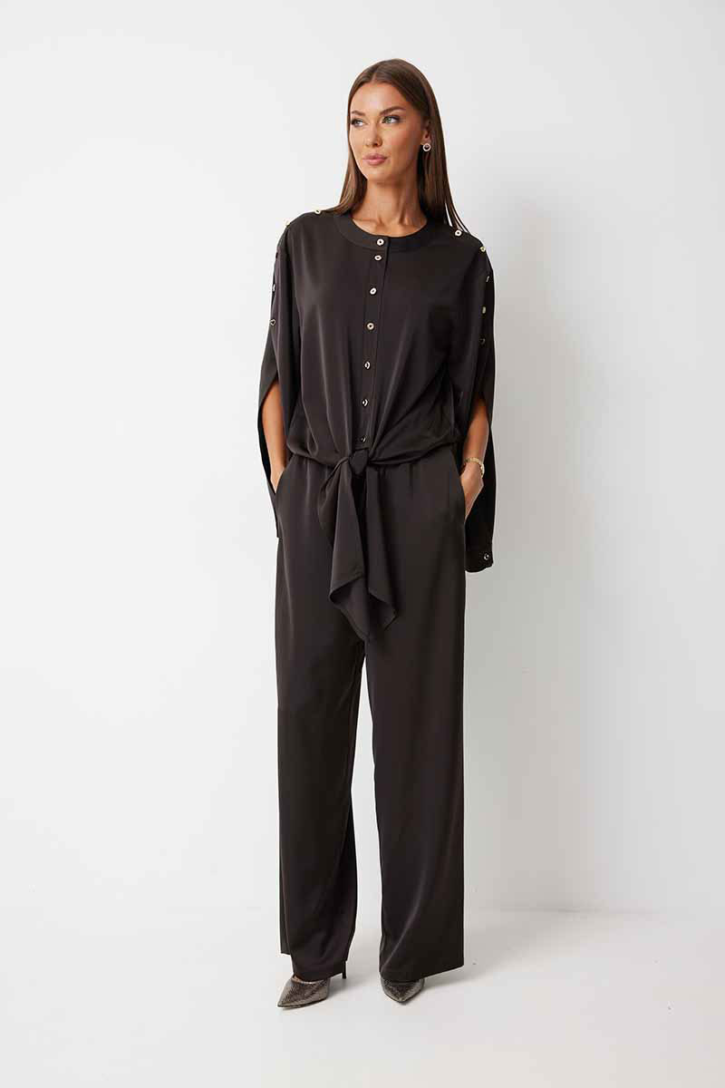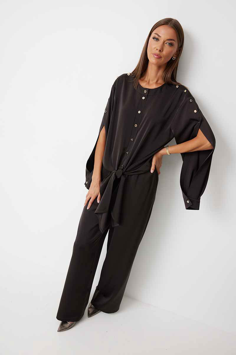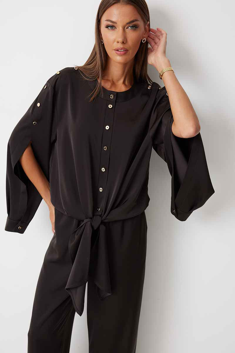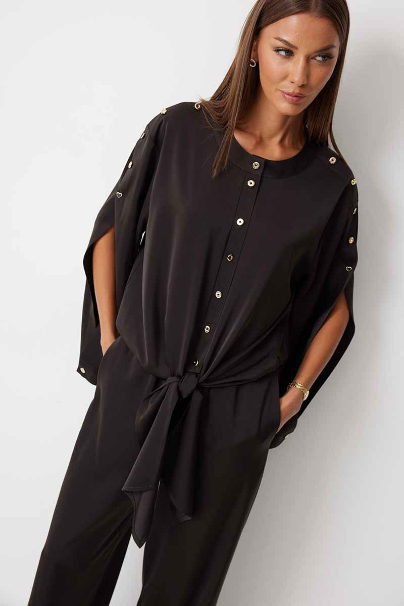 Блузка прямого силуэта с втачными фантазийными рукавами и разноуровневой линией низа. Блузка по переду предполагает завязку полочек и застегивается на петли пуговицы. Спинка блузки обработана резинкой по нижнему срезу. Горловина блузки обработана отрезной стойкой. Рукав с плечевым швом застегивается на декоративные пуговицы. По низу рукава расположена складка, рукав обработан притачной манжетой застегивающейся на петлю и пуговицу.