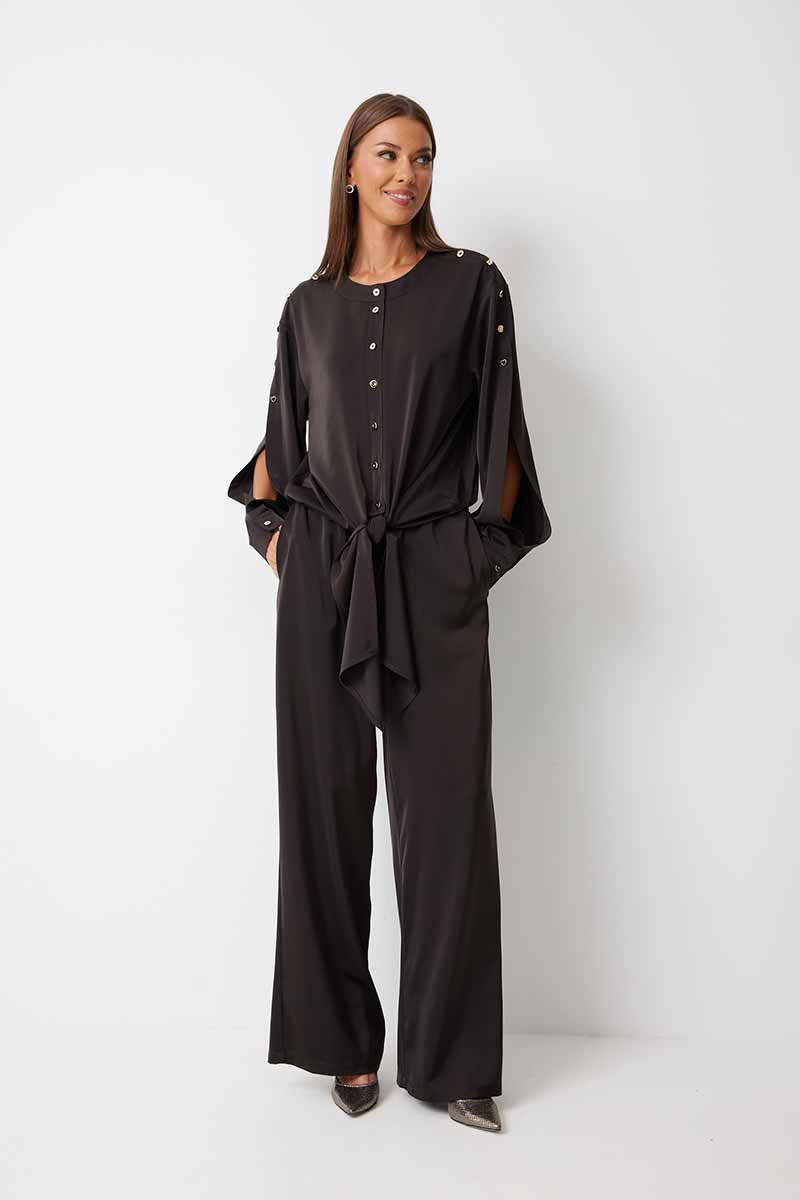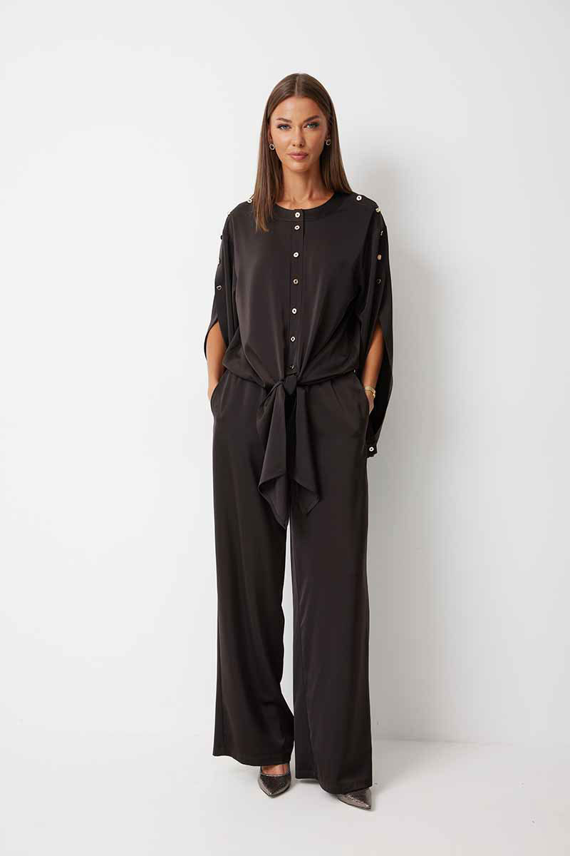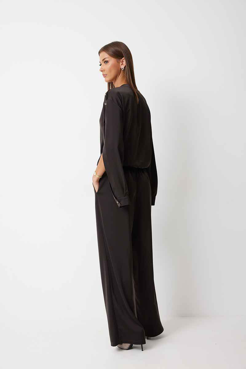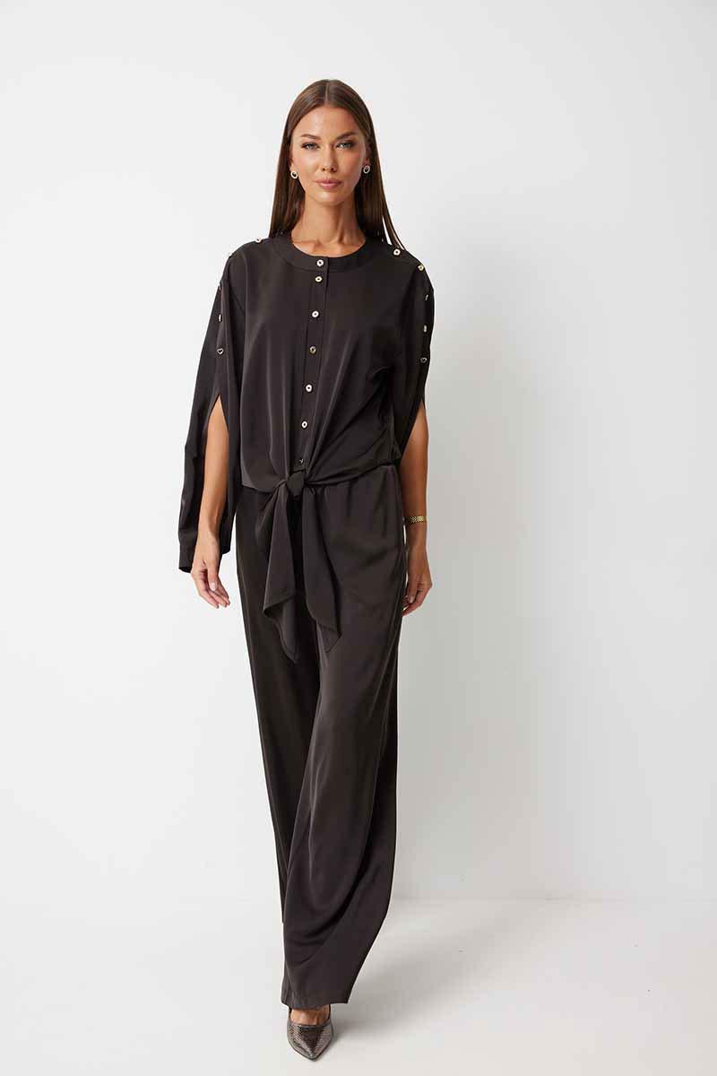 Брюки прямого силуэта полной длинны В боковых швах брюк обработаны карманы. Верх брюк обработан отрезным поясом «на резинке».