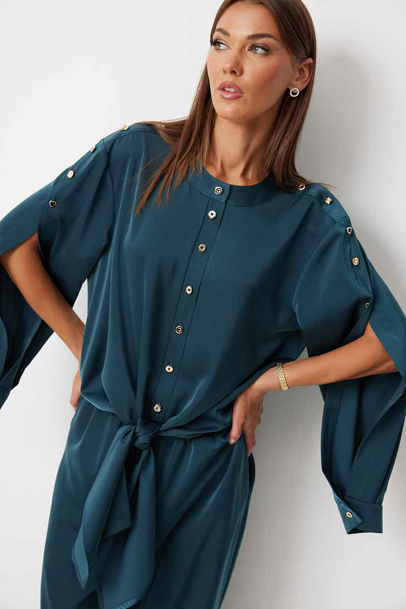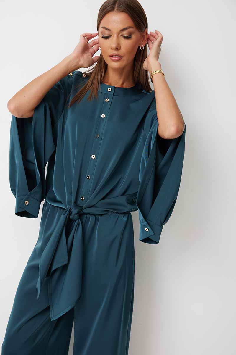 Блузка прямого силуэта с втачными фантазийными рукавами и разноуровневой линией низа. Блузка по переду предполагает завязку полочек и застегивается на петли пуговицы. Спинка блузки обработана резинкой по нижнему срезу. Горловина блузки обработана отрезной стойкой. Рукав с плечевым швом застегивается на декоративные пуговицы. По низу рукава расположена складка, рукав обработан притачной манжетой застегивающейся на петлю и пуговицу.