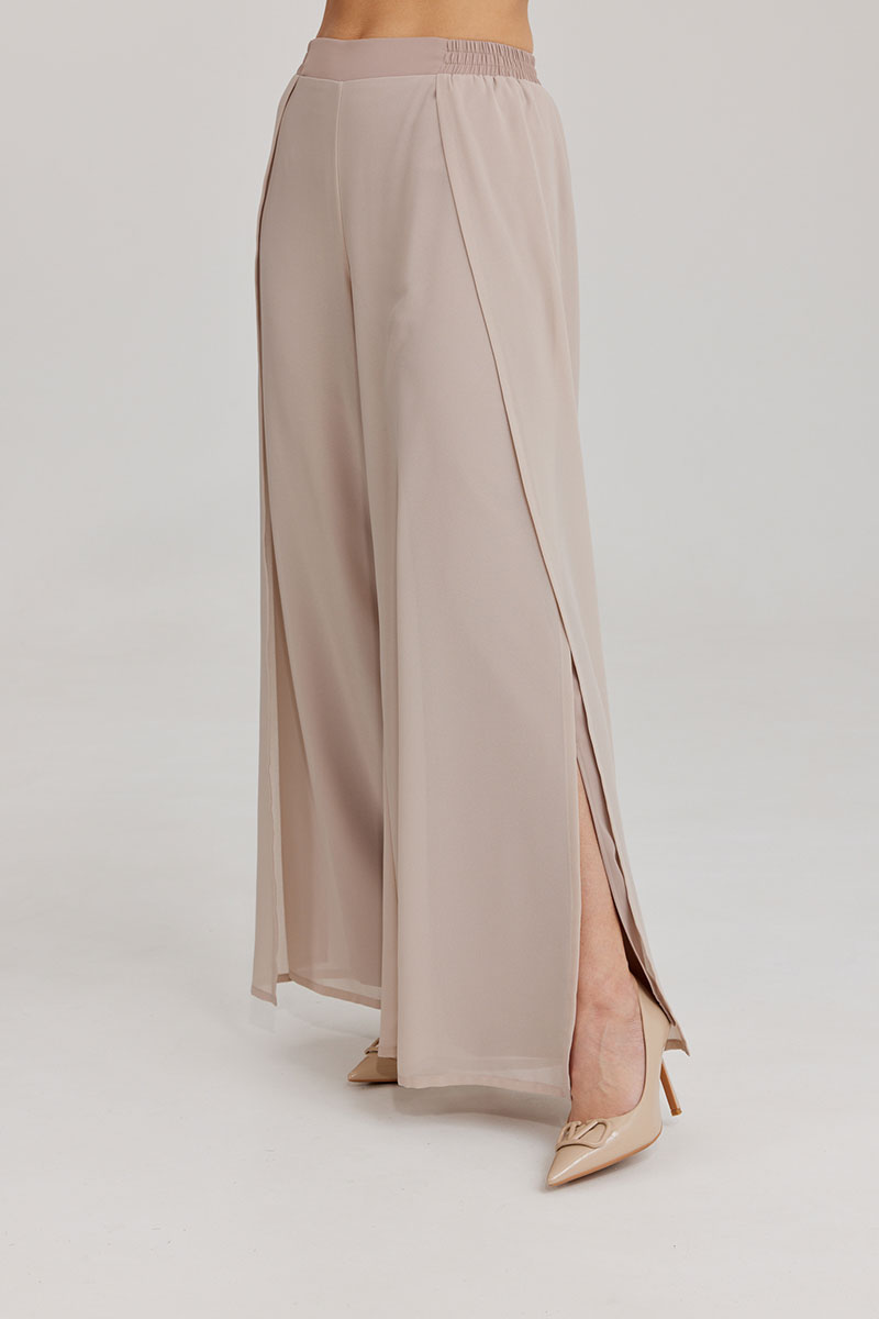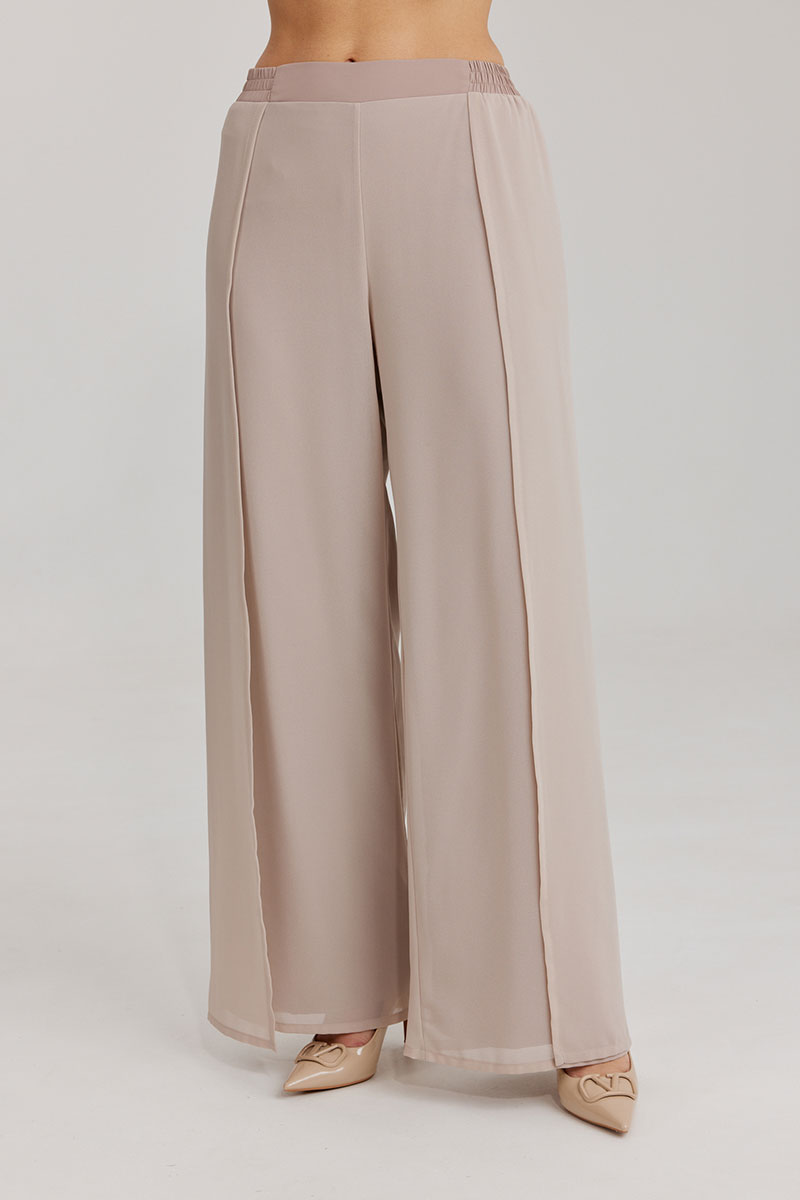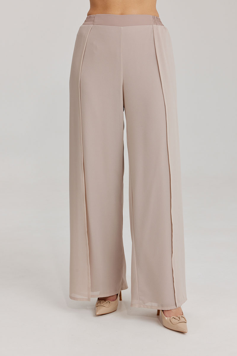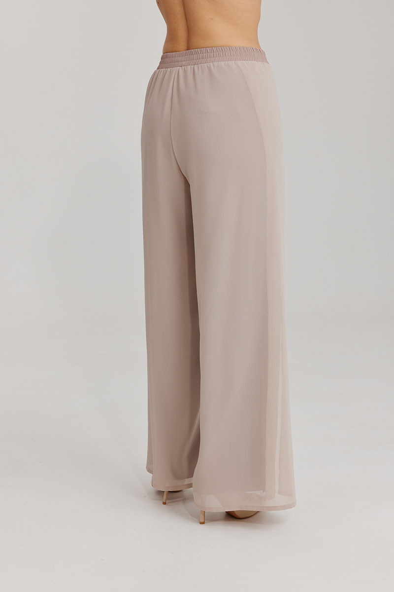 Брюки прямого силуэта, выполнены из шифоновой ткани на подкладке полной длинны. Боковой шов брюк открыт. Синка брюк заходит на перед по верхней части. Подкладка из не просвещающейся креповой ткани. Верх брюк обработан отрезным поясом. Центральная часть пояса без резинки, остальной пояс на резинке. Низ брюк обработан швом « в подгибку».